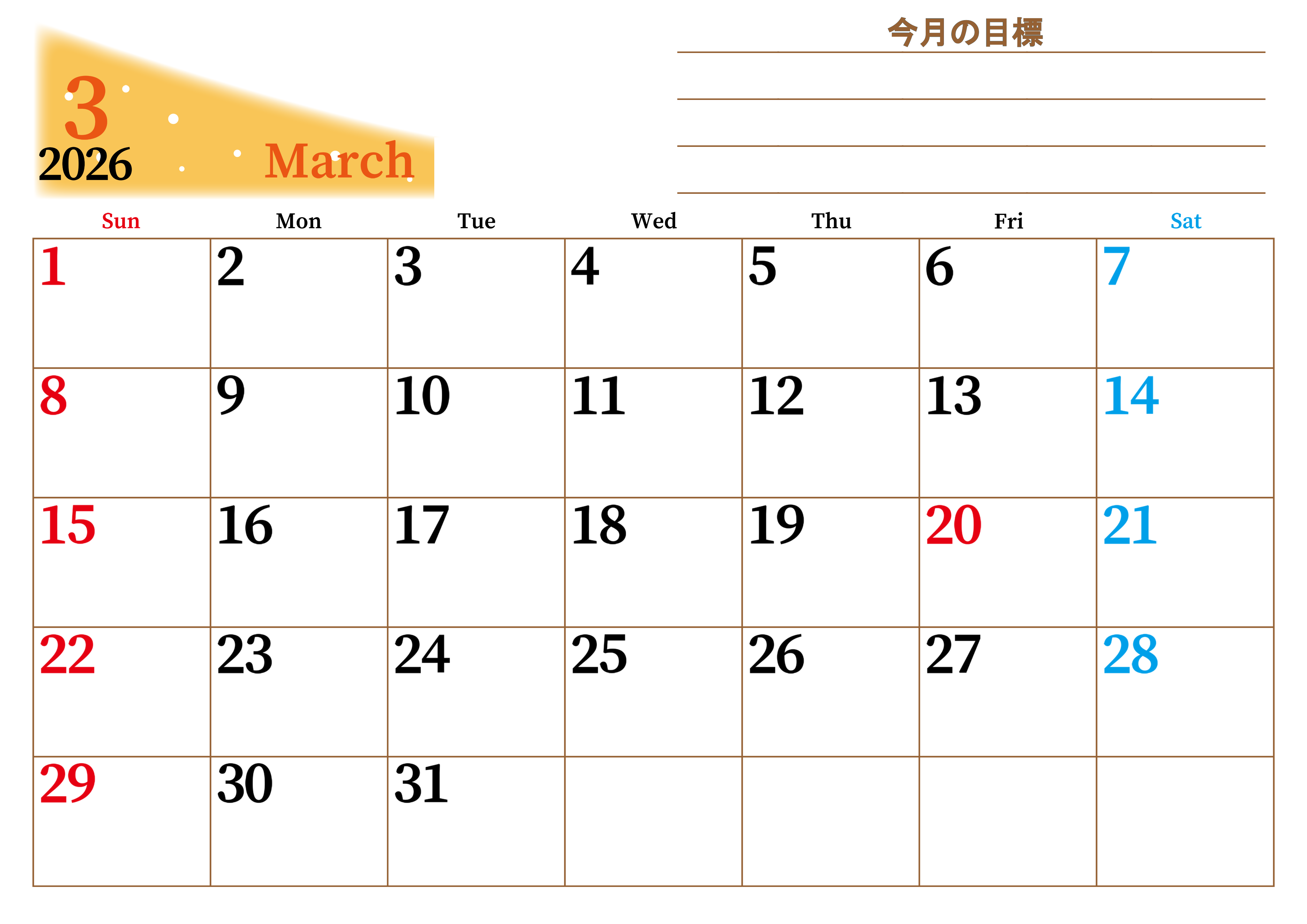 2026年3月カレンダーは横型日曜始まりで目標管理におすすめです。勉強を継続するのに最適です。A4用紙に印刷をしましょう。無料ダウンロードしましょう。(2026-01530300)