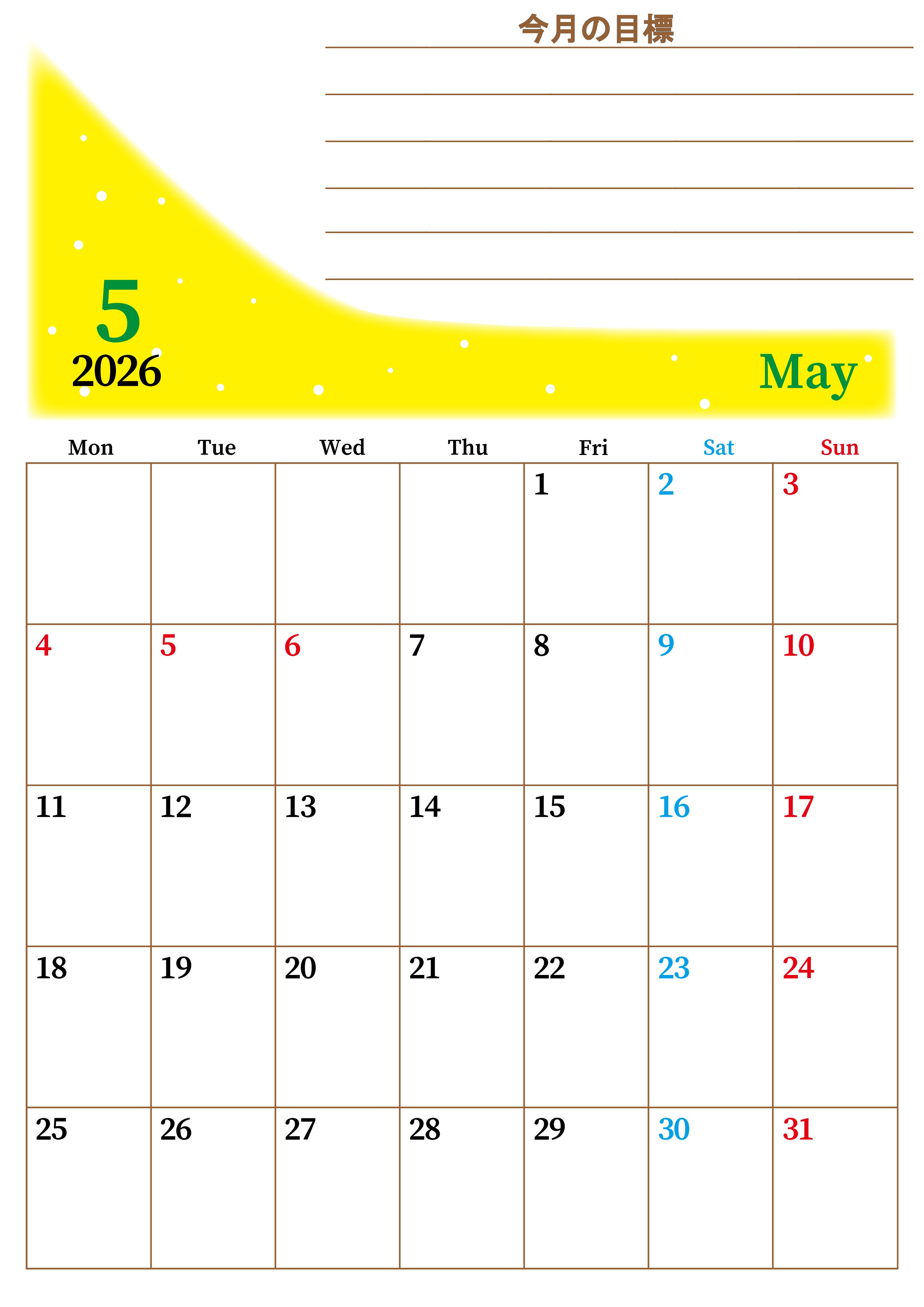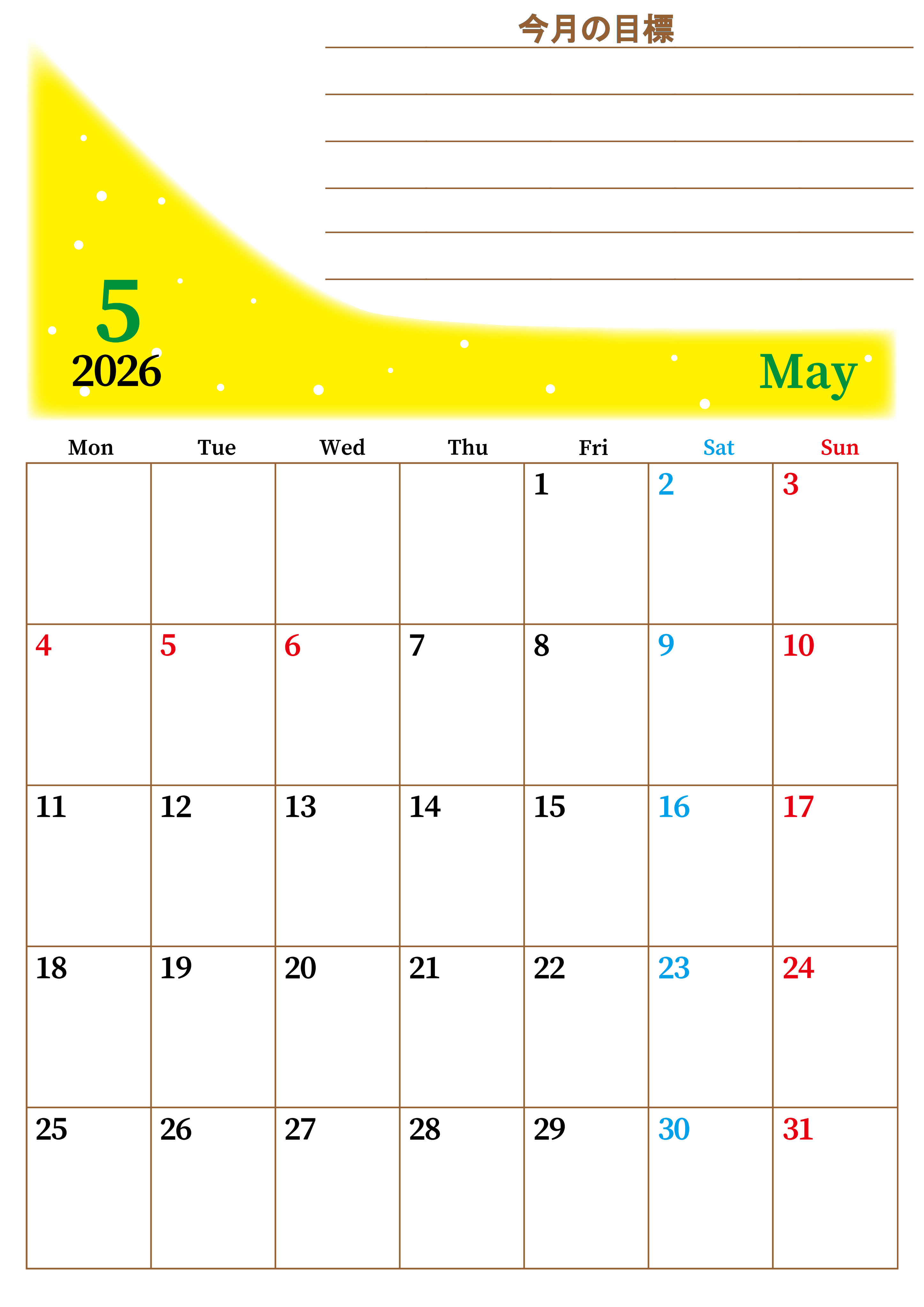 2026年5月カレンダーは縦型月曜始まりで目標管理におすすめです。勉強を継続するのに最適です。A4用紙に印刷をしましょう。無料ダウンロードしましょう。(2026-01530511)