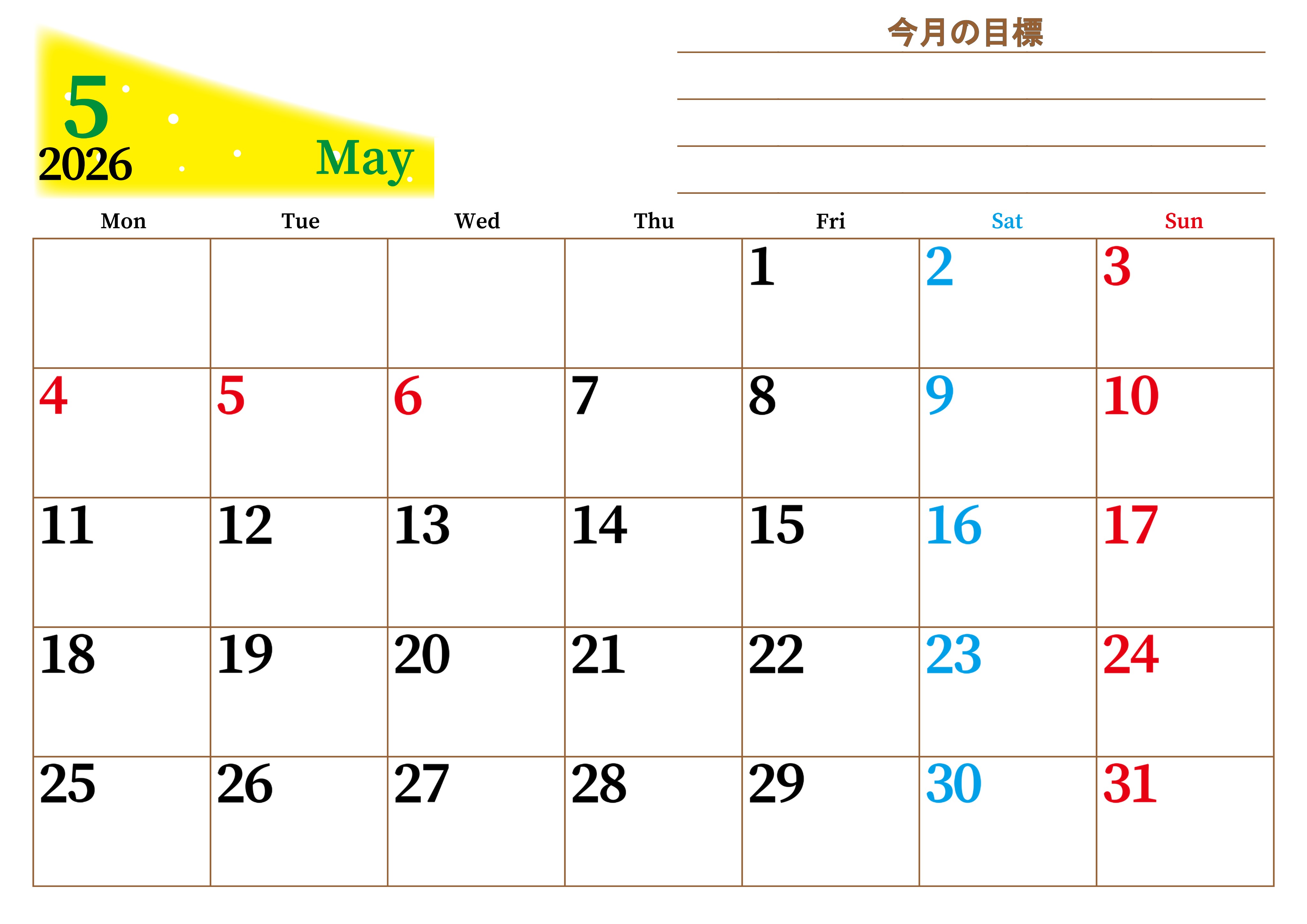 2026年・無料のカレンダーテンプレート 2026年5月カレンダーは横型月曜始まりで目標管理におすすめ♪勉強を継続するのに最適:無料(2026-01530501) 素材状デザイン王 2025年4月13日 2026年5月カレンダーは横型月曜始まりで目標管理におすすめです。勉強を継続するのに最適です。A4用紙に印刷をしましょう。無料ダウンロードしましょう。(2026-01530501) 5月 横型のカレンダー 月曜始まり 目標 カレンダーデザイン-0153