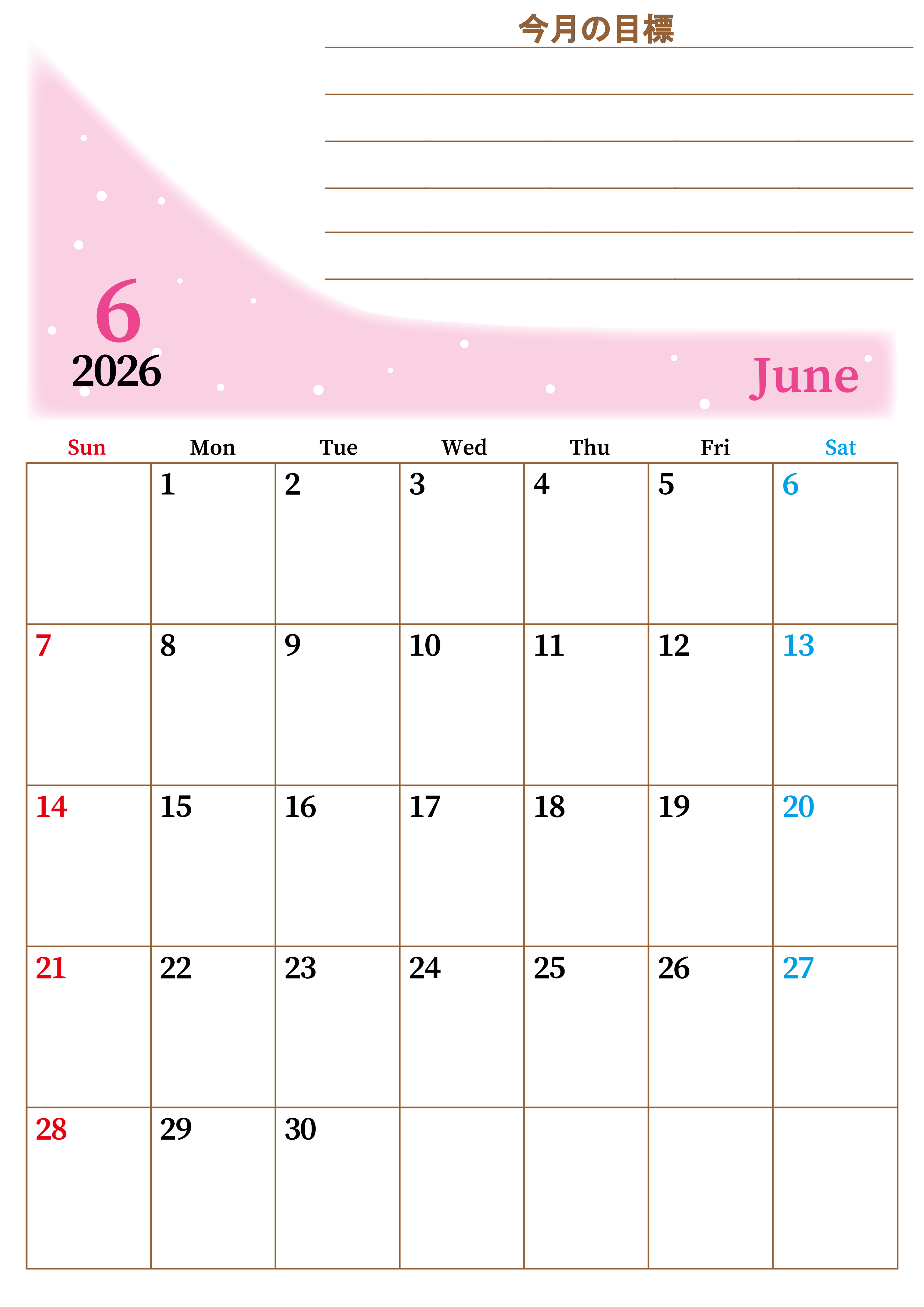 2026年・無料のカレンダーテンプレート 2026年6月カレンダーは縦型日曜始まりで目標管理におすすめ♪勉強を継続するのに最適:無料(2026-01530610) 素材状デザイン王 2025年4月13日 2026年6月カレンダーは縦型日曜始まりで目標管理におすすめです。勉強を継続するのに最適です。A4用紙に印刷をしましょう。無料ダウンロードしましょう。(2026-01530610) 6月 縦型のカレンダー 日曜始まり 目標 カレンダーデザイン-0153