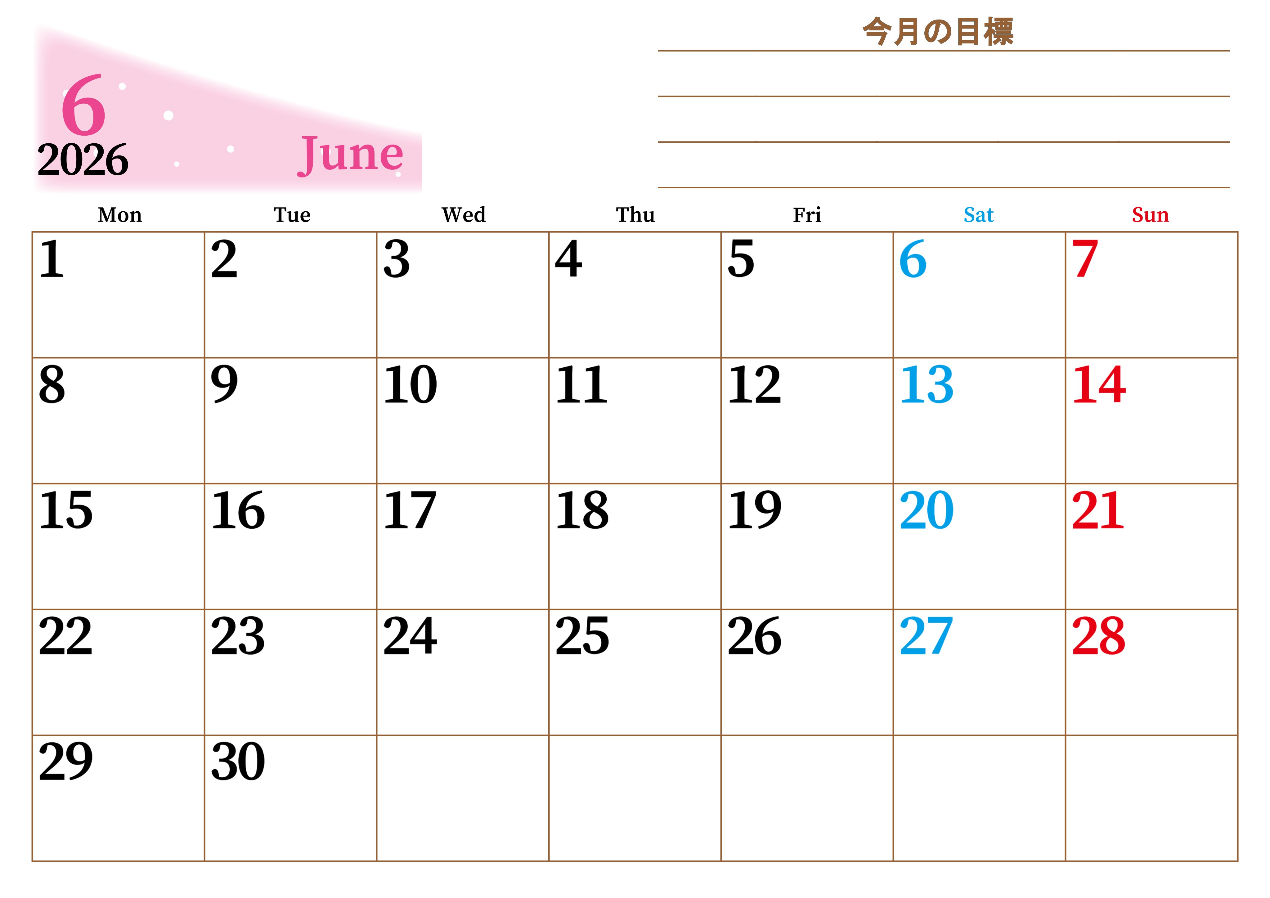 2026年・無料のカレンダーテンプレート 2026年6月カレンダーは横型月曜始まりで目標管理におすすめ♪勉強を継続するのに最適:無料(2026-01530601) 素材状デザイン王 2025年4月13日 2026年6月カレンダーは横型月曜始まりで目標管理におすすめです。勉強を継続するのに最適です。A4用紙に印刷をしましょう。無料ダウンロードしましょう。(2026-01530601) 6月 横型のカレンダー 月曜始まり 目標 カレンダーデザイン-0153