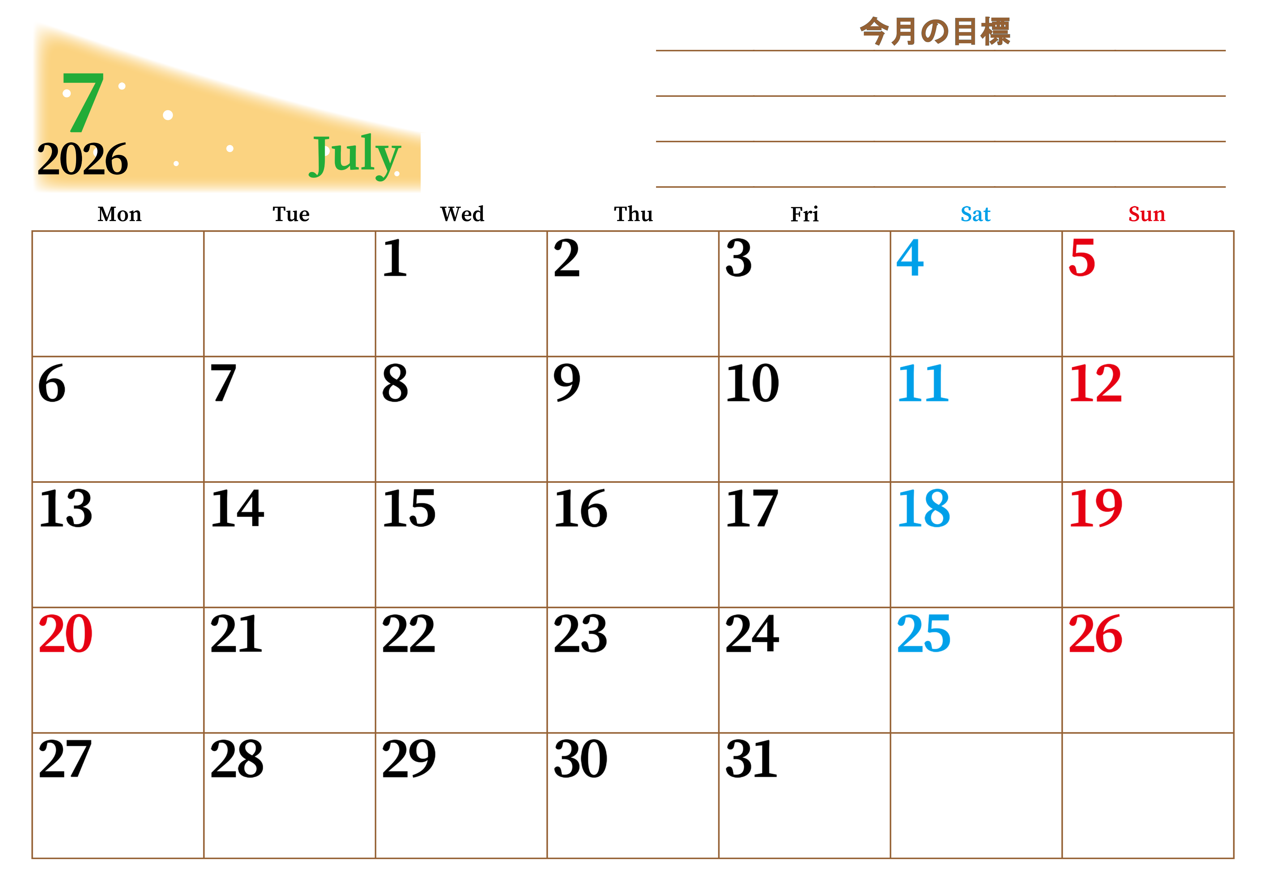 2026年・無料のカレンダーテンプレート 2026年7月カレンダーは横型月曜始まり でベージュの花がおしゃれ:無料(2026-01530701) 素材状デザイン王 2025年4月13日 2026年7月カレンダーは横型月曜始まりで目標管理におすすめです。勉強を継続するのに最適です。A4用紙に印刷をしましょう。無料ダウンロードしましょう。(2026-01530701) 7月 横型のカレンダー 月曜始まり 目標 カレンダーデザイン-0153