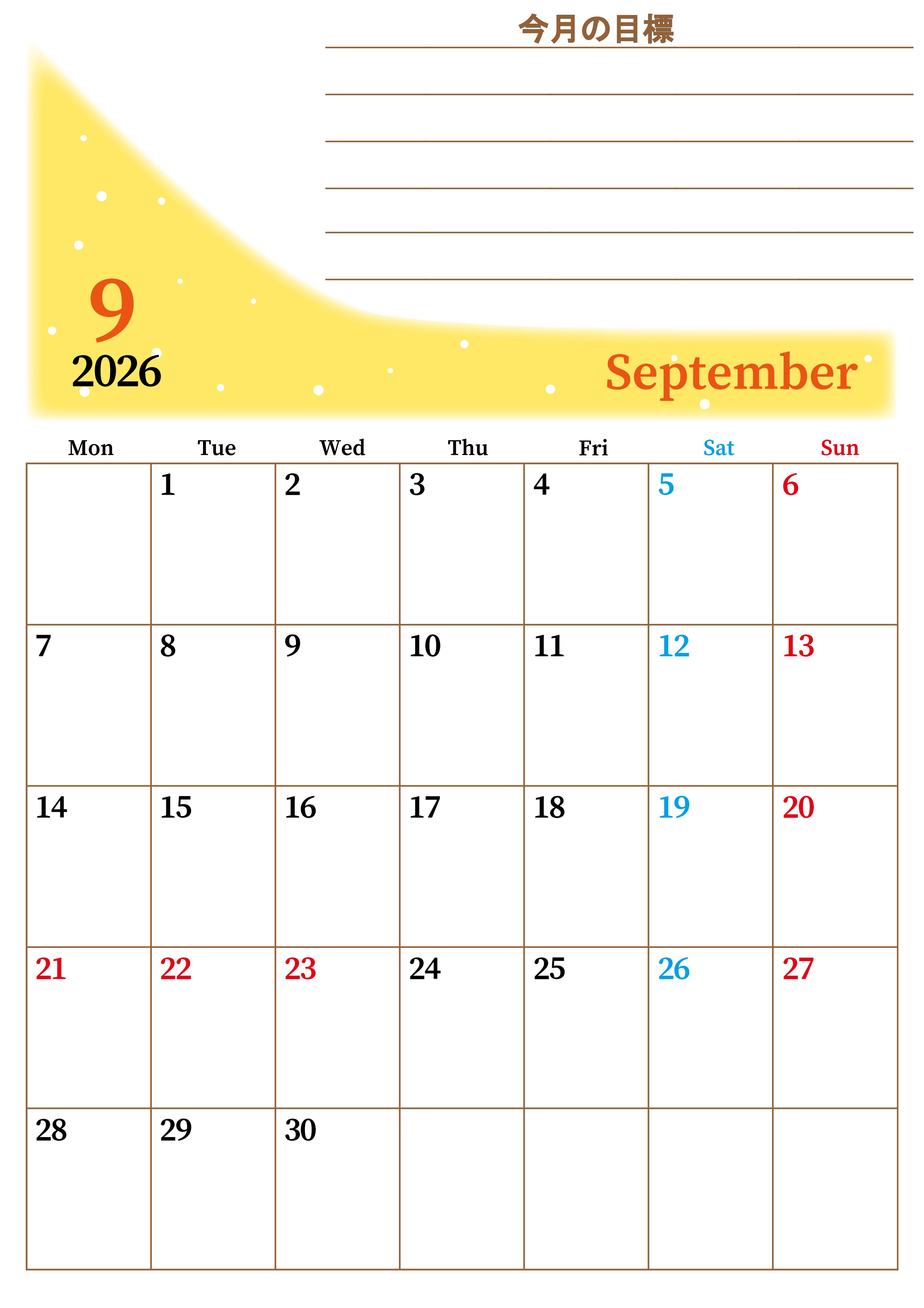 2026年・無料のカレンダーテンプレート 2026年9月カレンダーは縦型月曜始まりで目標管理におすすめ♪勉強を継続するのに最適:無料(2026-01530911) 素材状デザイン王 2025年4月13日 2026年9月カレンダーは縦型月曜始まりで目標管理におすすめです。勉強を継続するのに最適です。A4用紙に印刷をしましょう。無料ダウンロードしましょう。(2026-01530911) 9月 縦型のカレンダー 月曜始まり 目標 カレンダーデザイン-0153