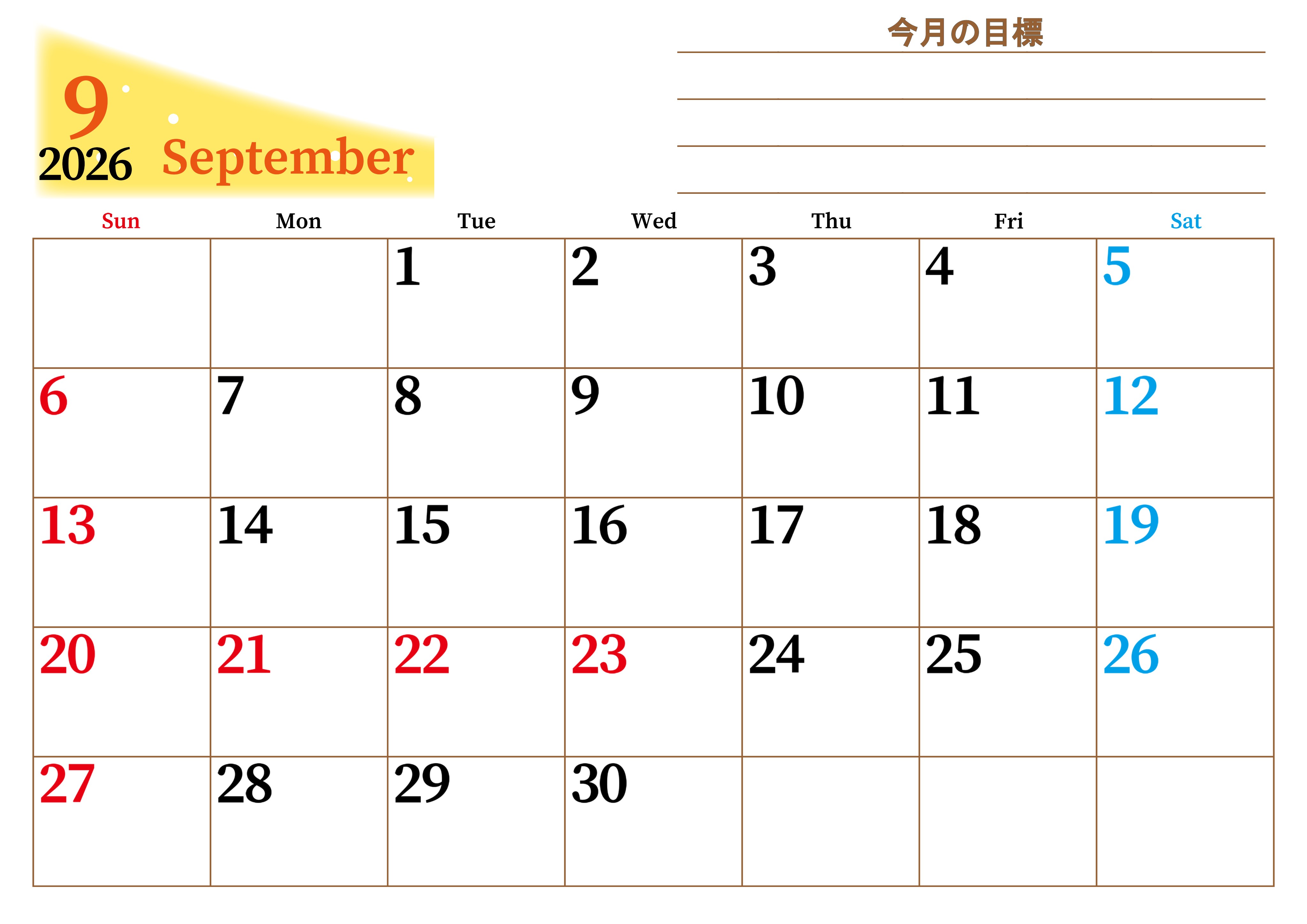 2026年9月カレンダーは横型日曜始まりで目標管理におすすめです。勉強を継続するのに最適です。A4用紙に印刷をしましょう。無料ダウンロードしましょう。(2026-01530900)