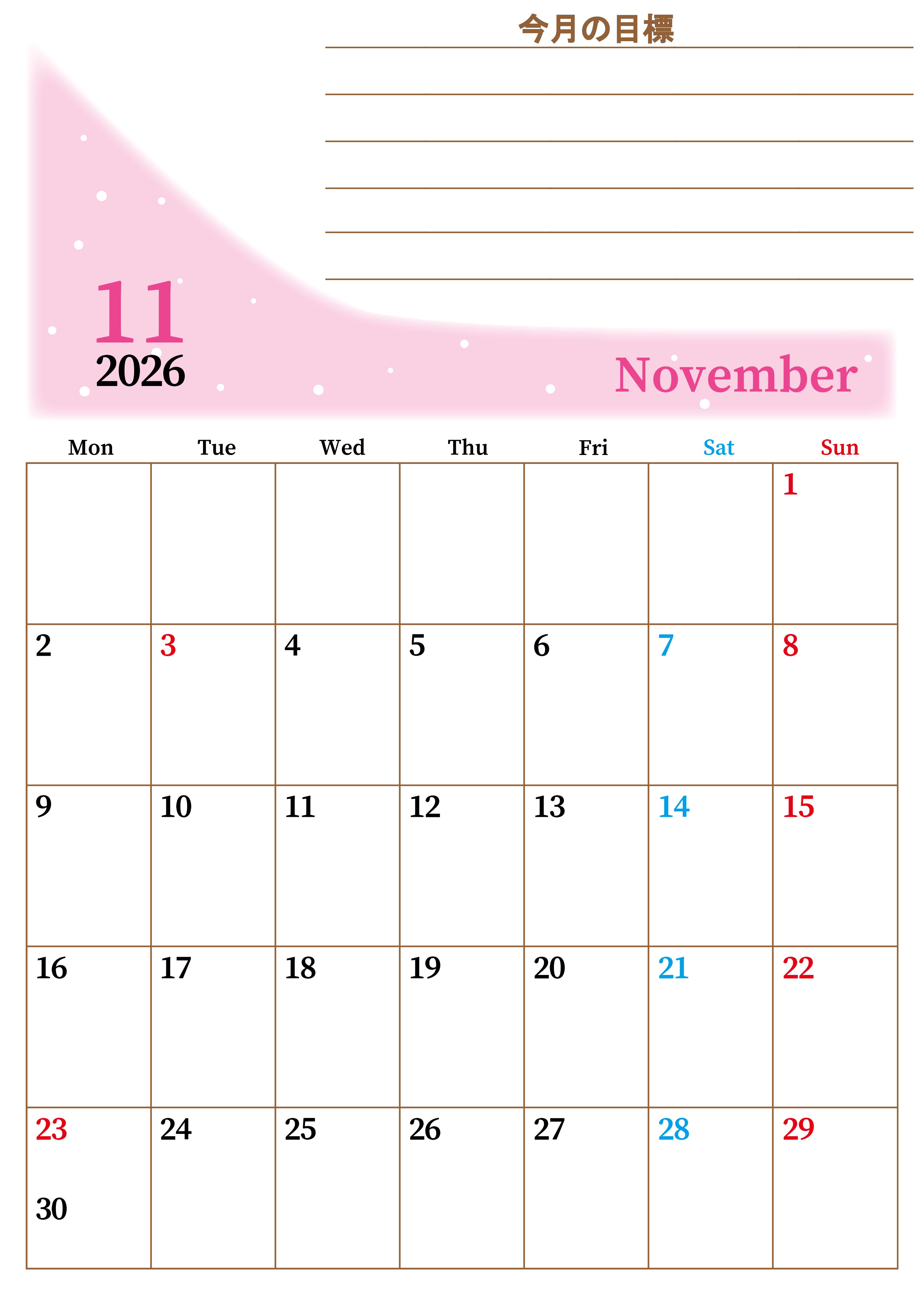 2026年・無料のカレンダーテンプレート 2026年11月カレンダーは縦型月曜始まりで目標管理におすすめ♪勉強を継続するのに最適:無料(2026-01531111) 素材状デザイン王 2025年4月13日 2026年11月カレンダーは縦型月曜始まりで目標管理におすすめです。勉強を継続するのに最適です。A4用紙に印刷をしましょう。無料ダウンロードしましょう。(2026-01531111) 11月 縦型のカレンダー 月曜始まり 目標 カレンダーデザイン-0153