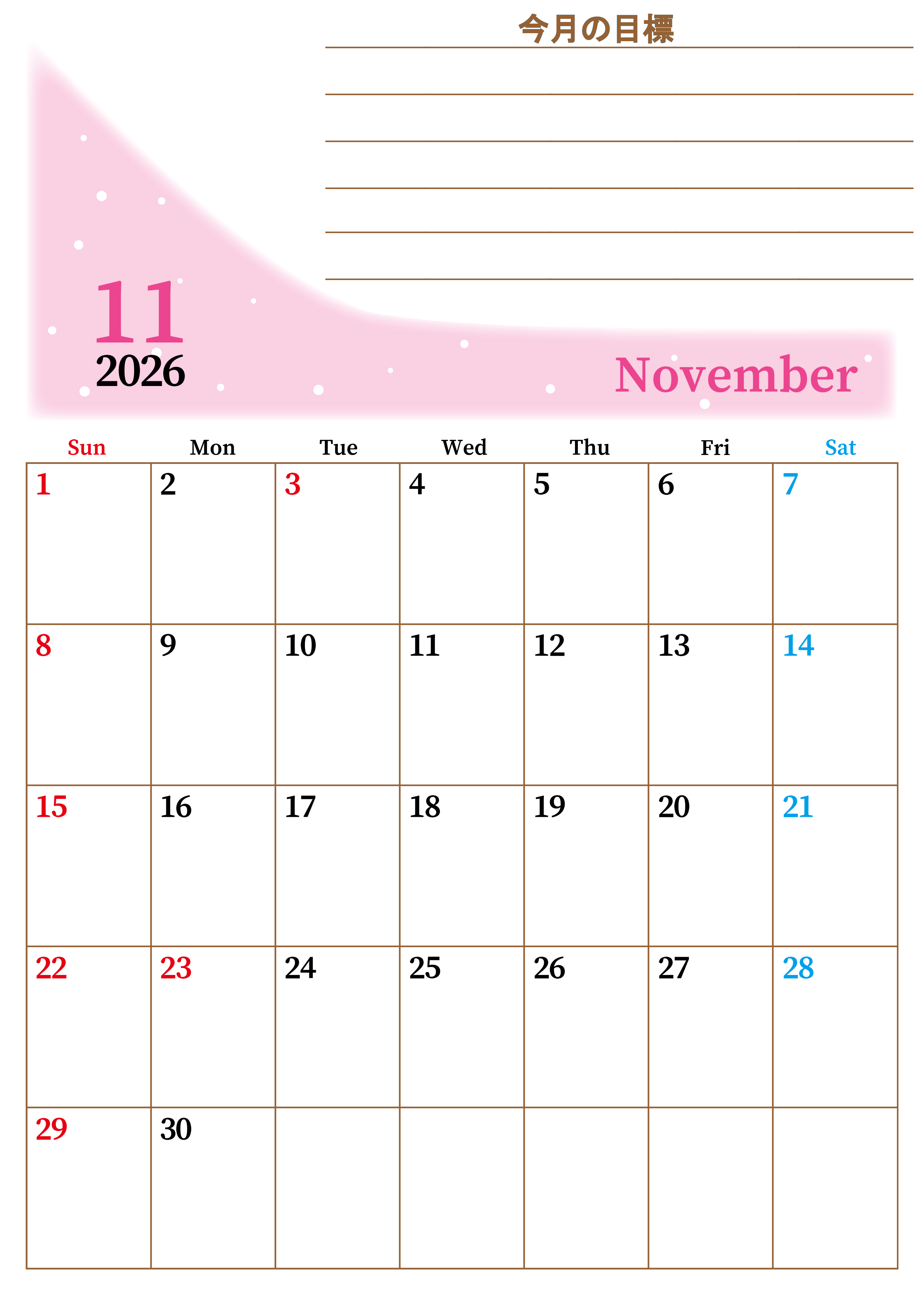 2026年11月カレンダーは縦型日曜始まりで目標管理におすすめです。勉強を継続するのに最適です。A4用紙に印刷をしましょう。無料ダウンロードしましょう。(2026-01531110)