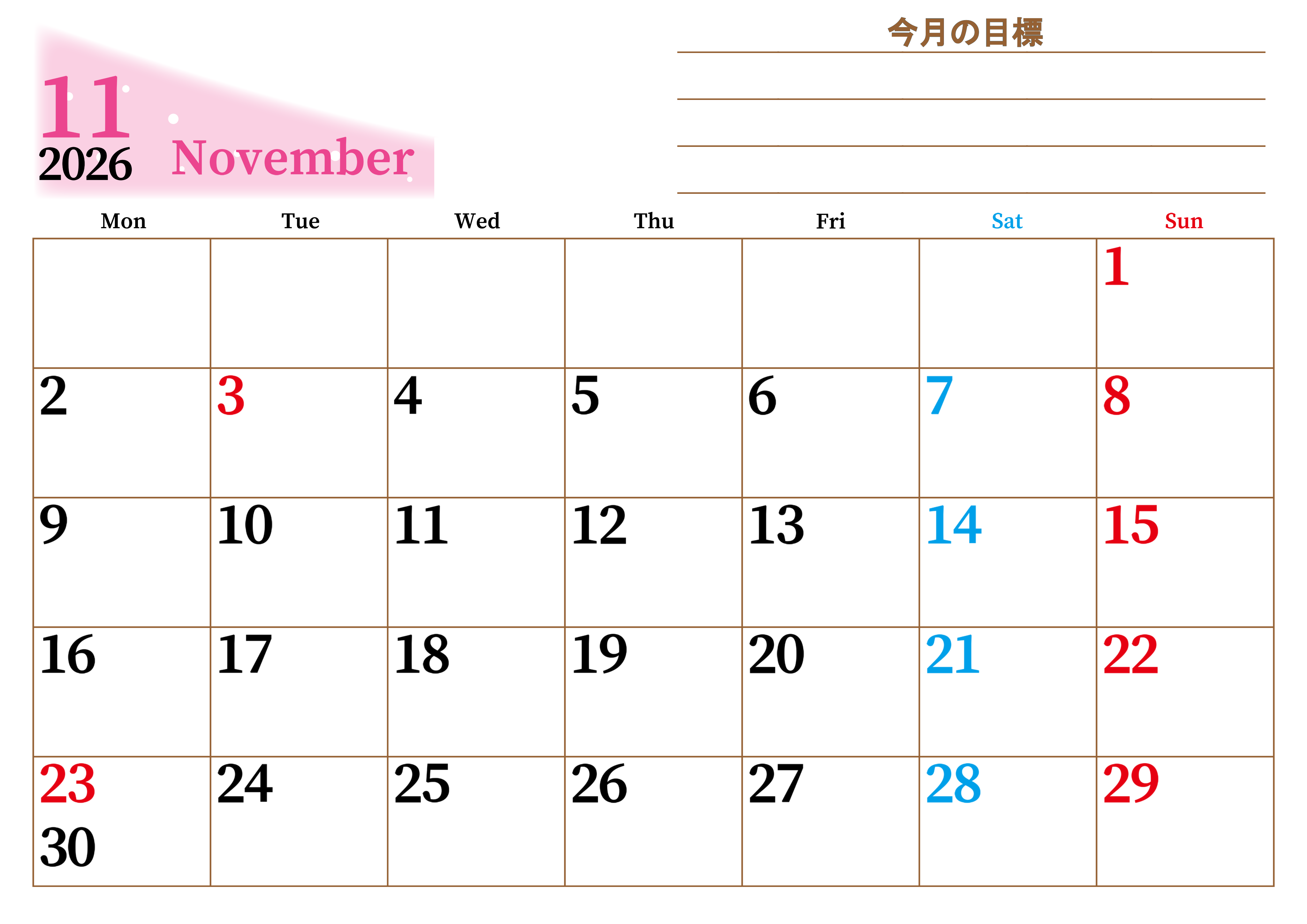 2026年・無料のカレンダーテンプレート 2026年11月カレンダーは横型月曜始まりで目標管理におすすめ♪勉強を継続するのに最適:無料(2026-01531101) 素材状デザイン王 2025年4月13日 2026年11月カレンダーは横型月曜始まりで目標管理におすすめです。勉強を継続するのに最適です。A4用紙に印刷をしましょう。無料ダウンロードしましょう。(2026-01531101) 11月 横型のカレンダー 月曜始まり 目標 カレンダーデザイン-0153