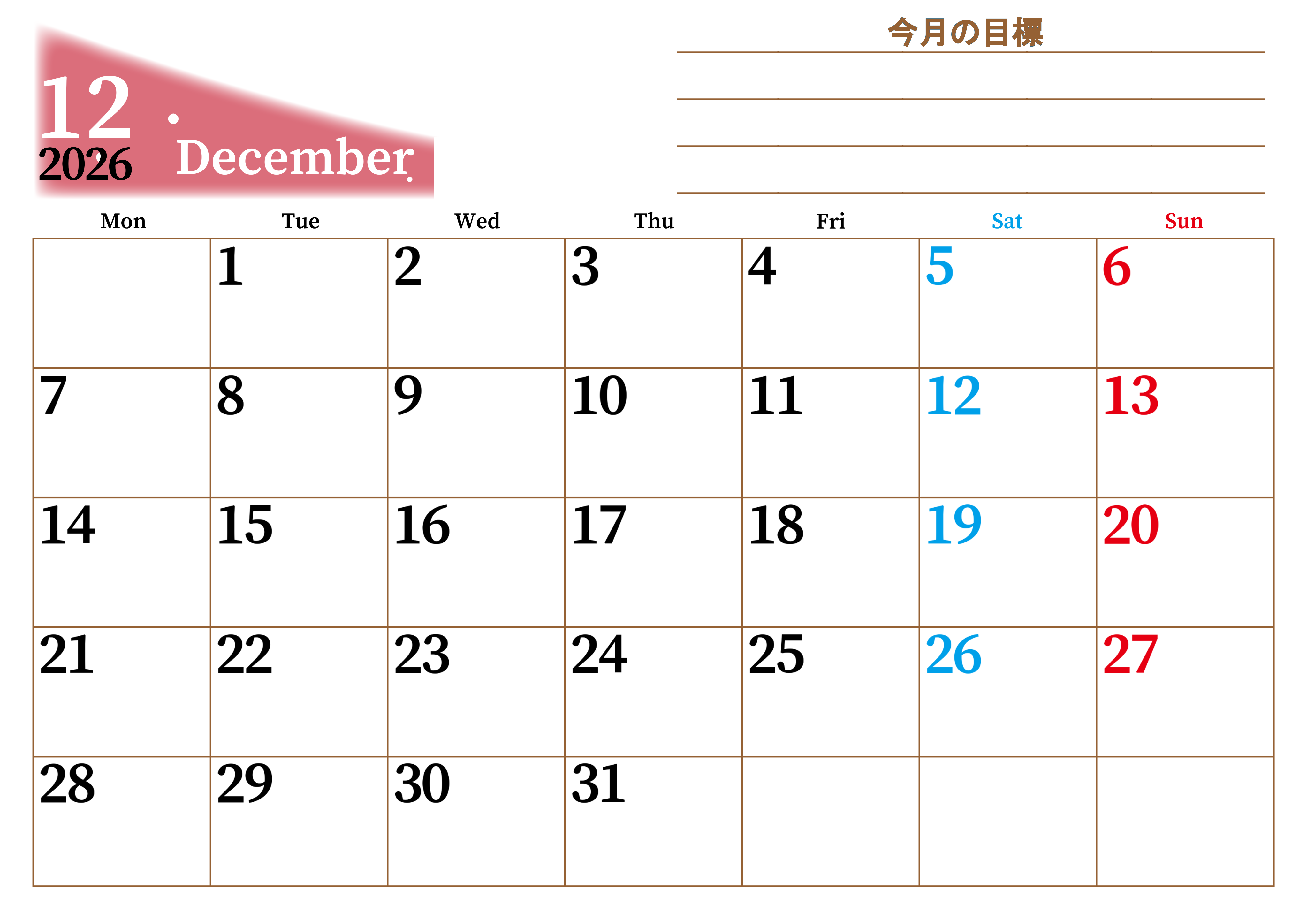 2026年12月カレンダーは横型月曜始まりで目標管理におすすめです。勉強を継続するのに最適です。A4用紙に印刷をしましょう。無料ダウンロードしましょう。(2026-01531201)