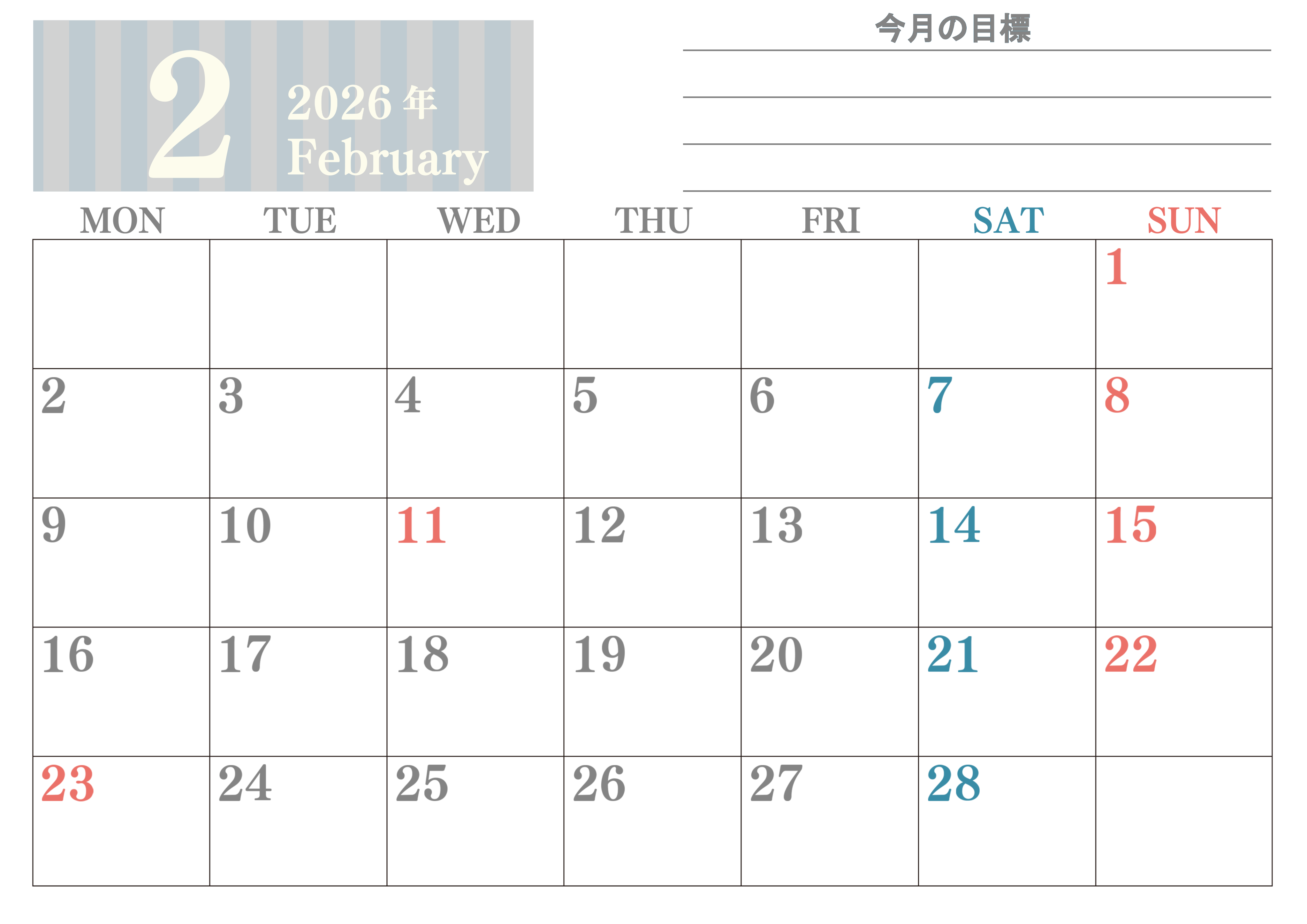2026年・無料のカレンダーテンプレート 2026年2月カレンダーは横型月曜始まりで季節の行事の絵文字イラストがかわいい♪ダウンロードは無料♪(2026-01540201) 素材状デザイン王 2025年4月13日 2026年2月カレンダーは横型月曜始まりで季節の行事の絵文字イラストがかわいいです。ダウンロードは無料なので継続して使いやすいカレンダーです。(2026-01540201) 2月 横型のカレンダー 月曜始まり 目標 カレンダーデザイン-0154