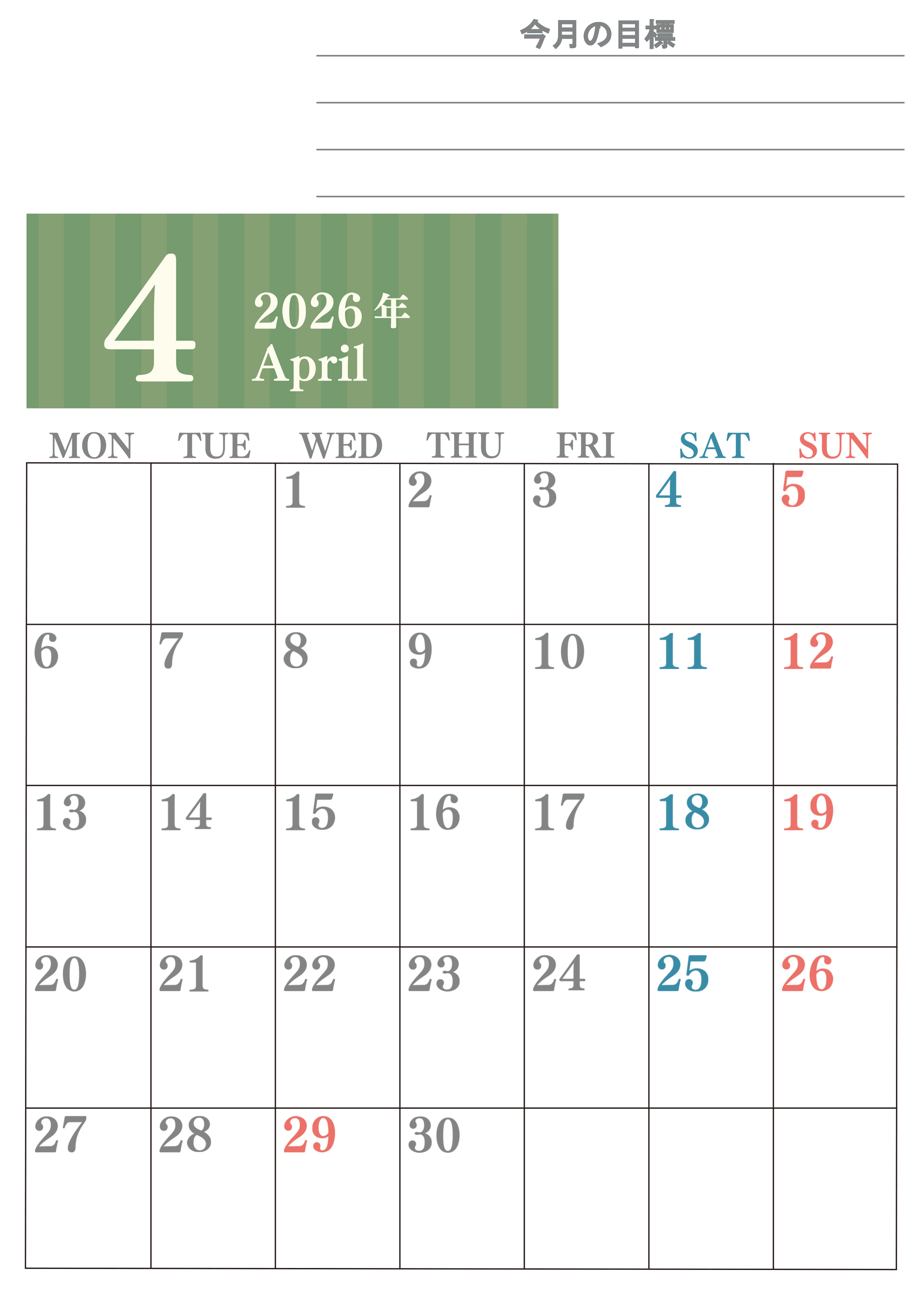 2026年・無料のカレンダーテンプレート 2026年4月カレンダーは縦型月曜始まりで季節の行事の絵文字イラストがかわいい♪ダウンロードは無料♪(2026-01540411) 素材状デザイン王 2025年4月13日 2026年4月カレンダーは縦型月曜始まりで季節の行事の絵文字イラストがかわいいです。ダウンロードは無料なので継続して使いやすいカレンダーです。(2026-01540411) 4月 縦型のカレンダー 月曜始まり 目標 カレンダーデザイン-0154