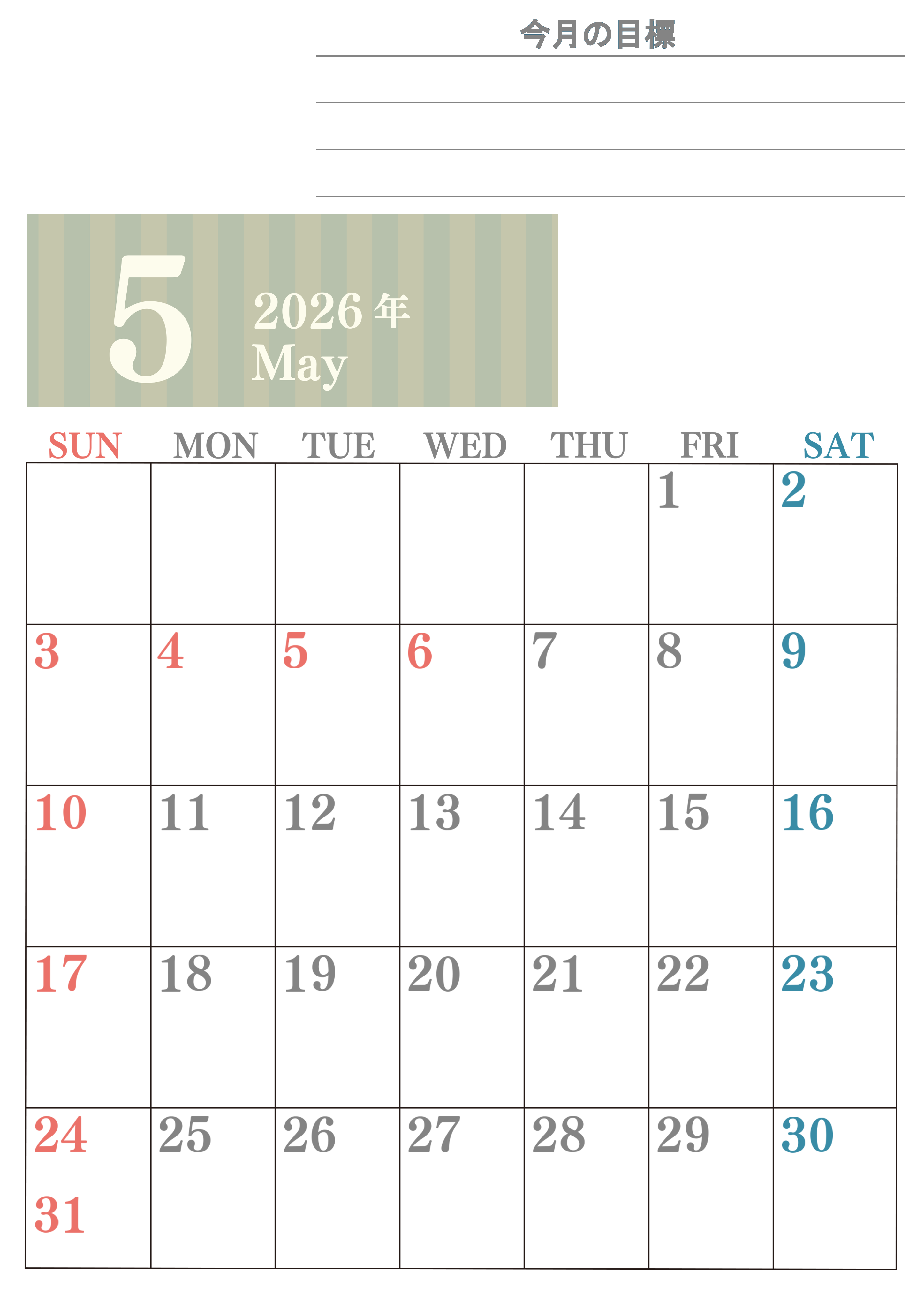 2026年・無料のカレンダーテンプレート 2026年5月カレンダーは縦型日曜始まりで季節の行事の絵文字イラストがかわいい♪ダウンロードは無料♪(2026-01540510) 素材状デザイン王 2025年4月13日 2026年5月カレンダーは縦型日曜始まりで季節の行事の絵文字イラストがかわいいです。ダウンロードは無料なので継続して使いやすいカレンダーです。(2026-01540510) 5月 縦型のカレンダー 日曜始まり 目標 カレンダーデザイン-0154