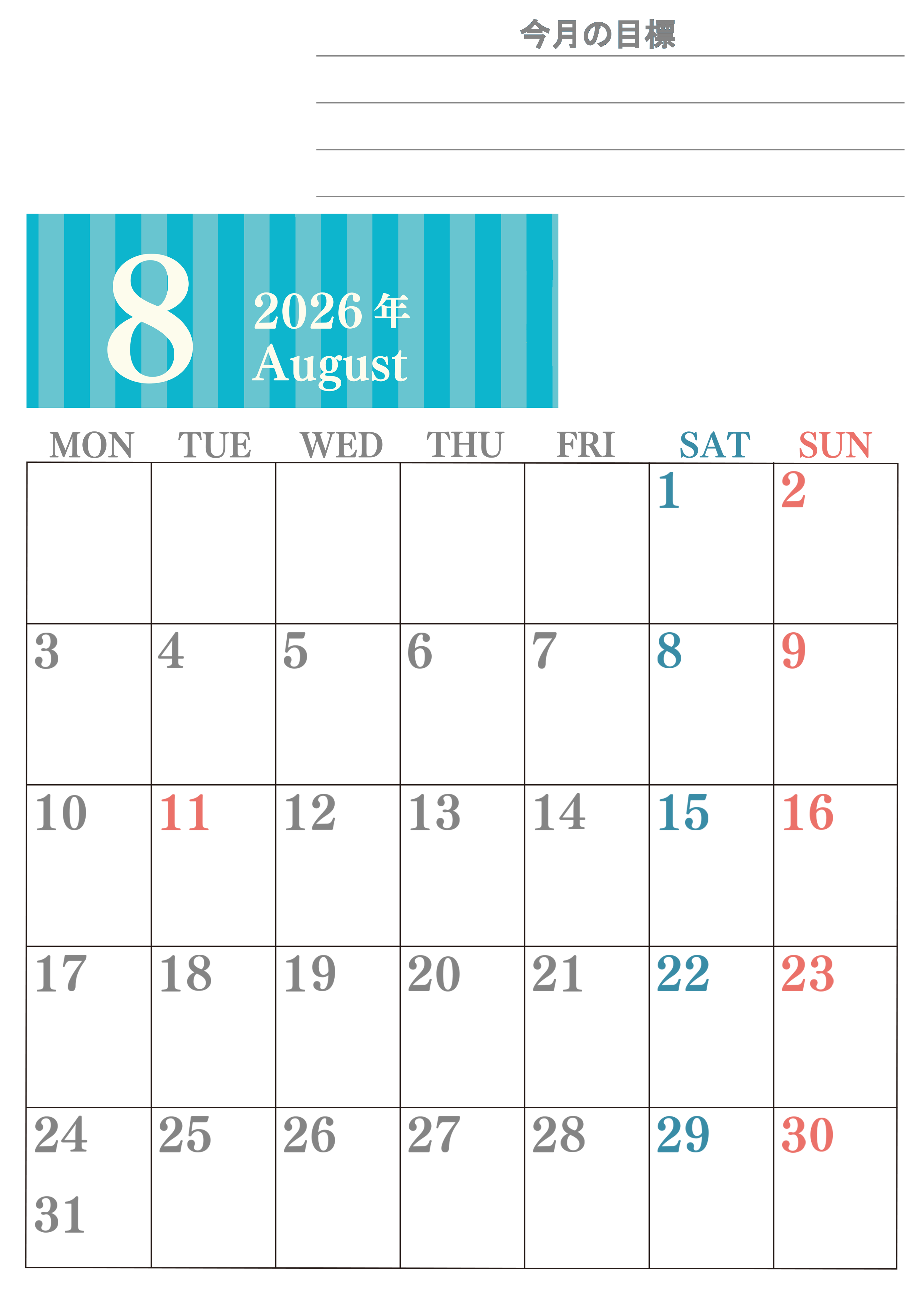 2026年8月カレンダーは縦型月曜始まりで季節の行事の絵文字イラストがかわいいです。ダウンロードは無料なので継続して使いやすいカレンダーです。(2026-01540811)