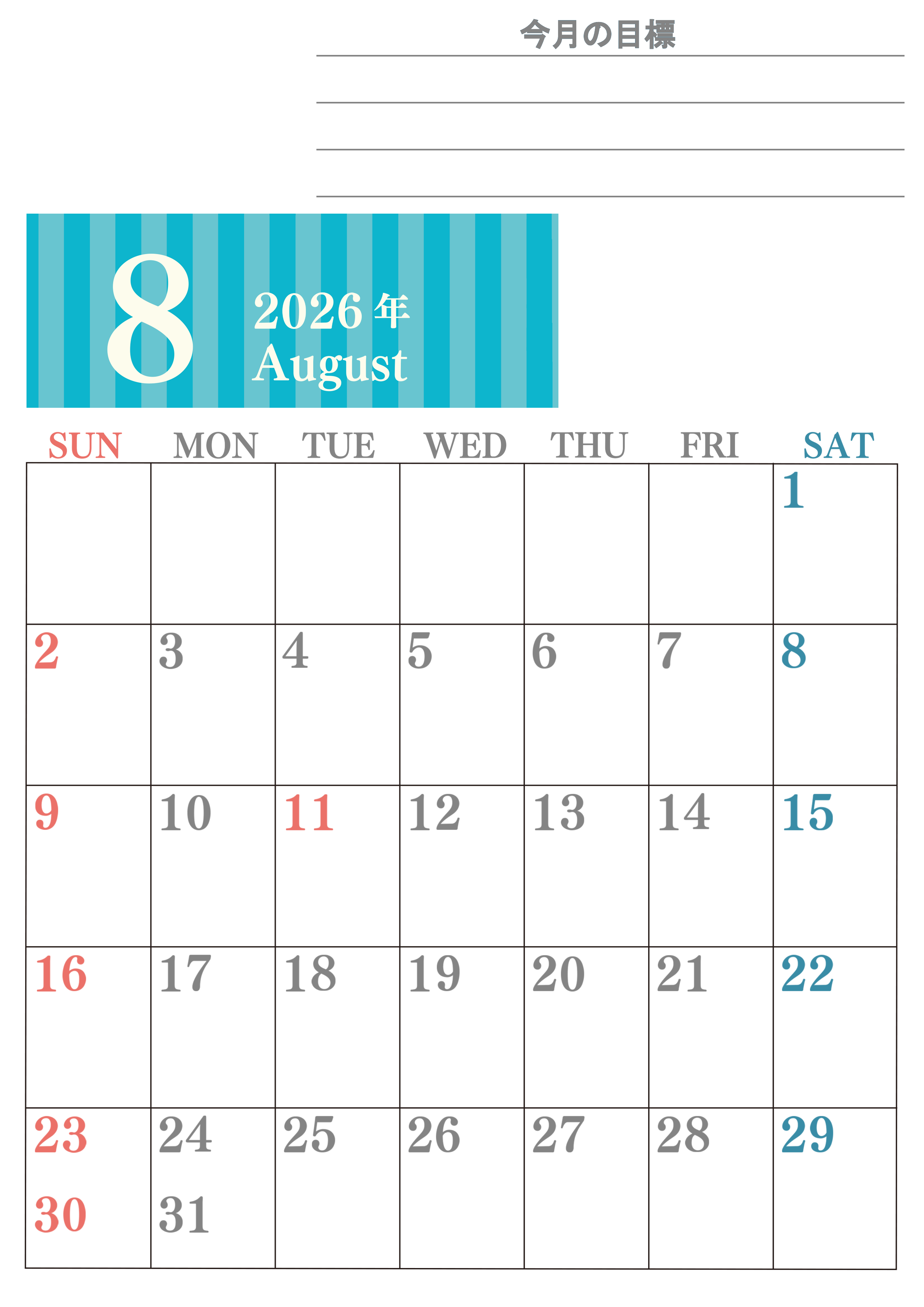2026年8月カレンダーは縦型日曜始まりで季節の行事の絵文字イラストがかわいいです。ダウンロードは無料なので継続して使いやすいカレンダーです。(2026-01540810)