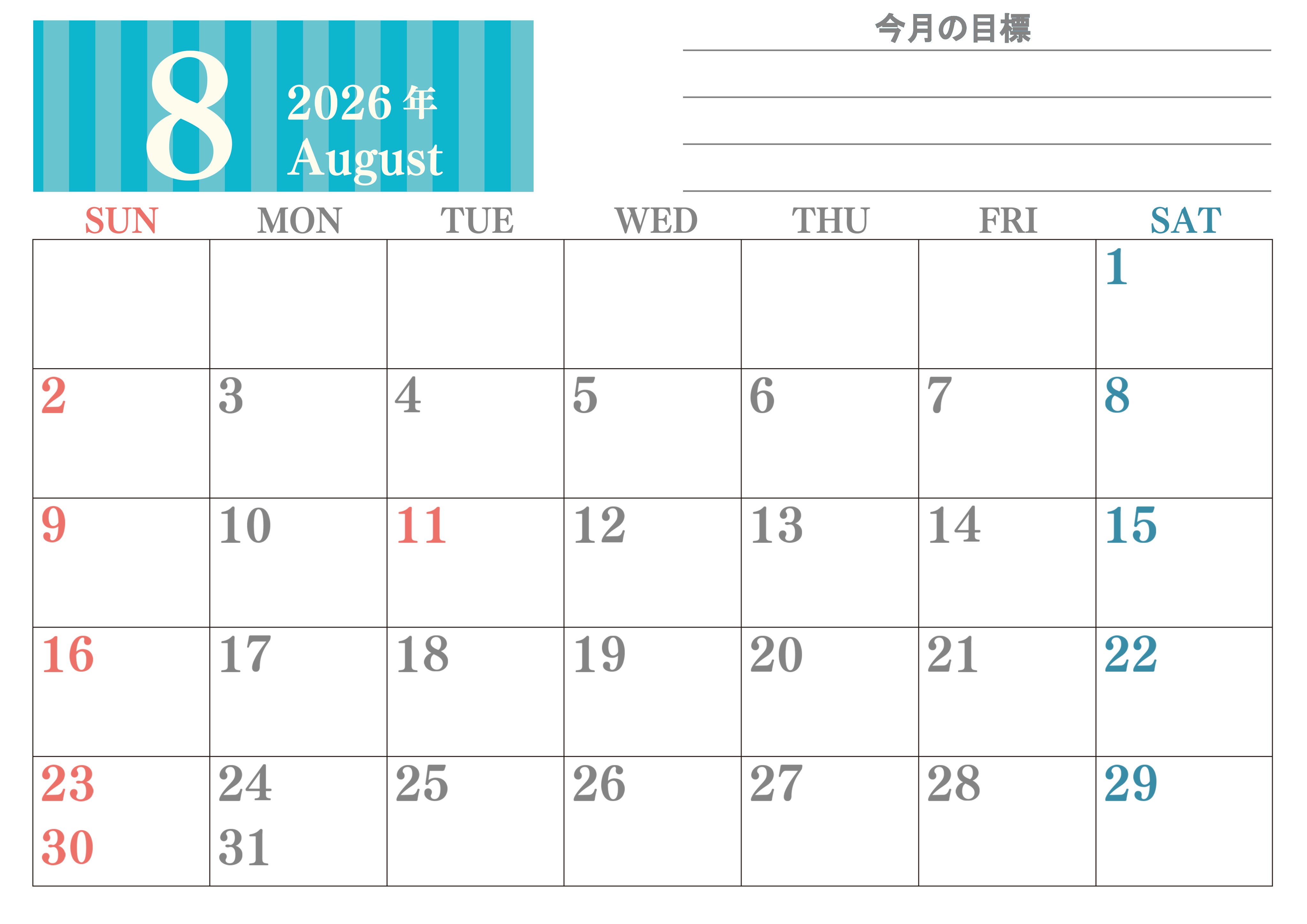2026年・無料のカレンダーテンプレート 2026年8月カレンダーは横型日曜始まりで季節の行事の絵文字イラストがかわいい♪ダウンロードは無料♪(2026-01540800) 素材状デザイン王 2025年4月13日 2026年8月カレンダーは横型日曜始まりで季節の行事の絵文字イラストがかわいいです。ダウンロードは無料なので継続して使いやすいカレンダーです。(2026-01540800) 8月 横型のカレンダー 日曜始まり 目標 カレンダーデザイン-0154
