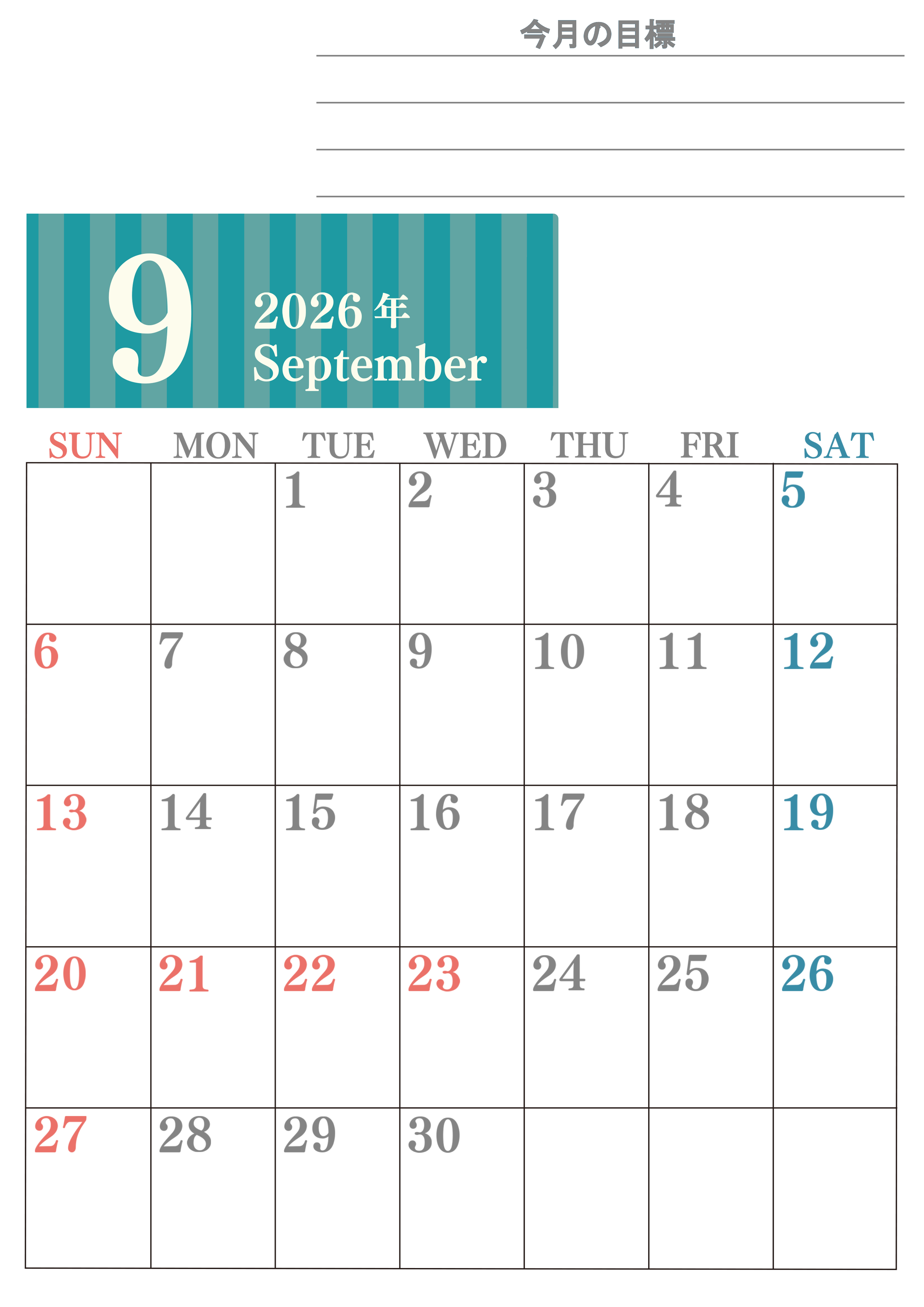 2026年・無料のカレンダーテンプレート 2026年9月カレンダーは縦型日曜始まりで季節の行事の絵文字イラストがかわいい♪ダウンロードは無料♪(2026-01540910) 素材状デザイン王 2025年4月13日 2026年9月カレンダーは縦型日曜始まりで季節の行事の絵文字イラストがかわいいです。ダウンロードは無料なので継続して使いやすいカレンダーです。(2026-01540910) 9月 縦型のカレンダー 日曜始まり 目標 カレンダーデザイン-0154