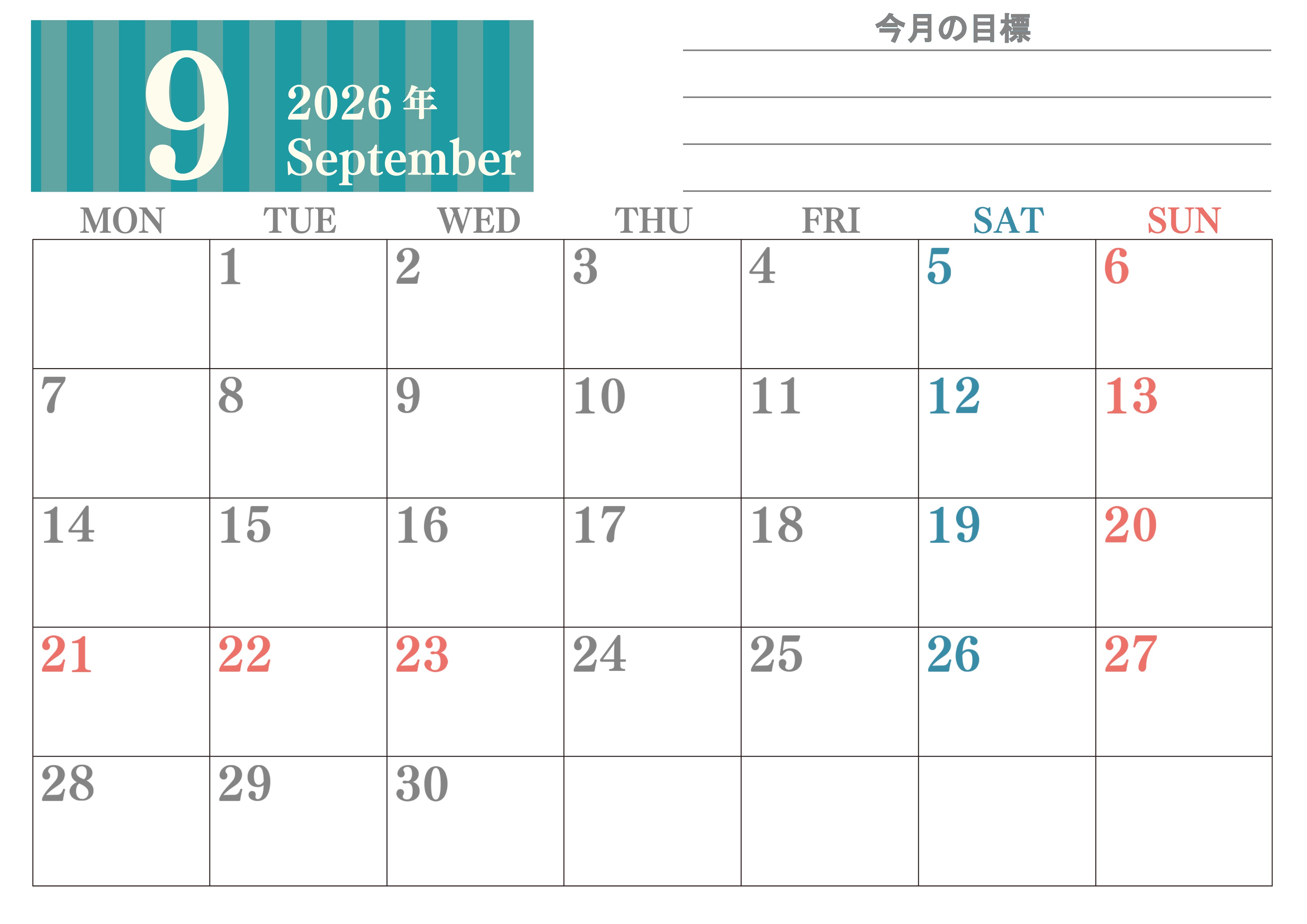 2026年9月カレンダーは横型月曜始まりで季節の行事の絵文字イラストがかわいい♪ダウンロードは無料♪(2026-01540901)