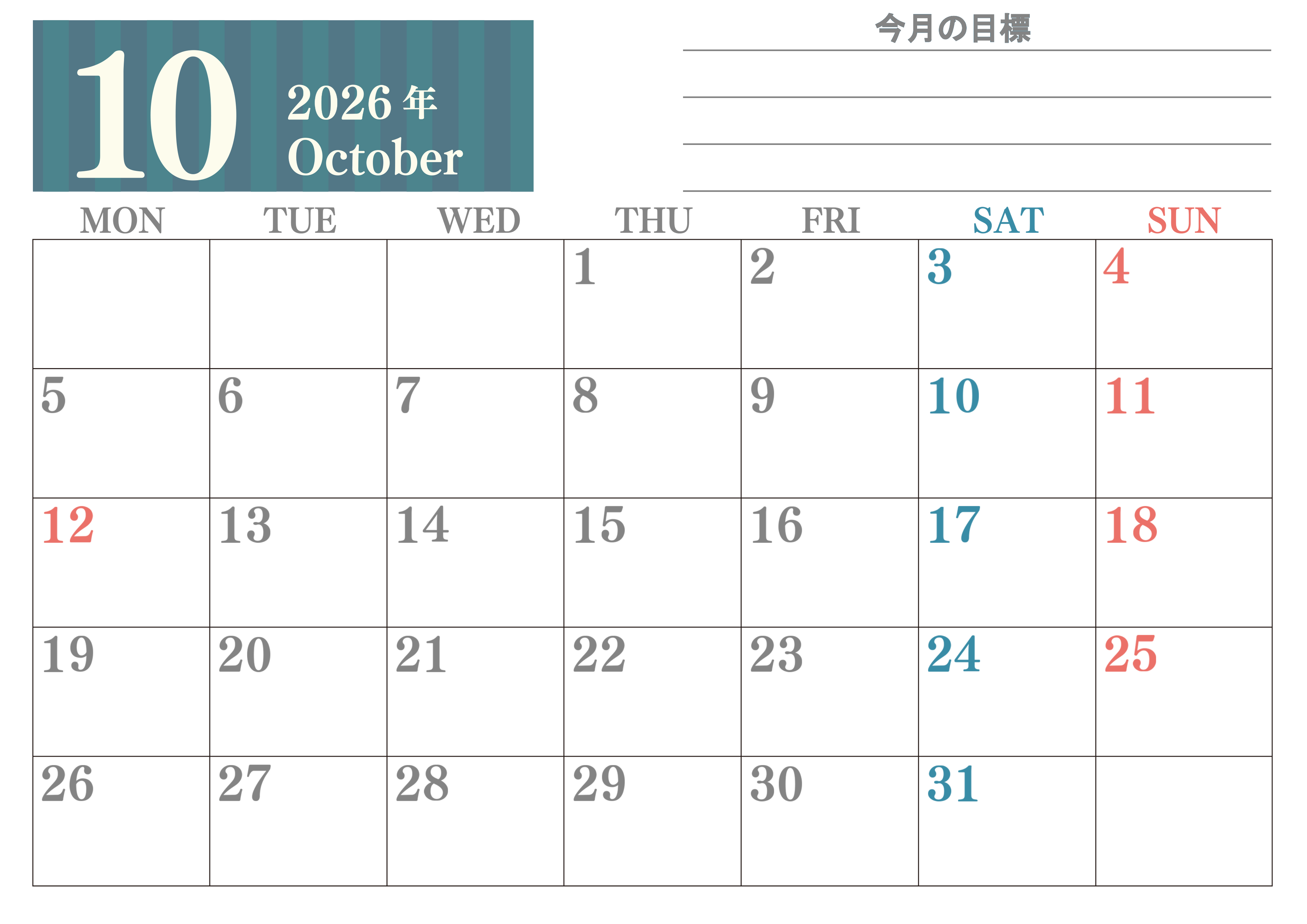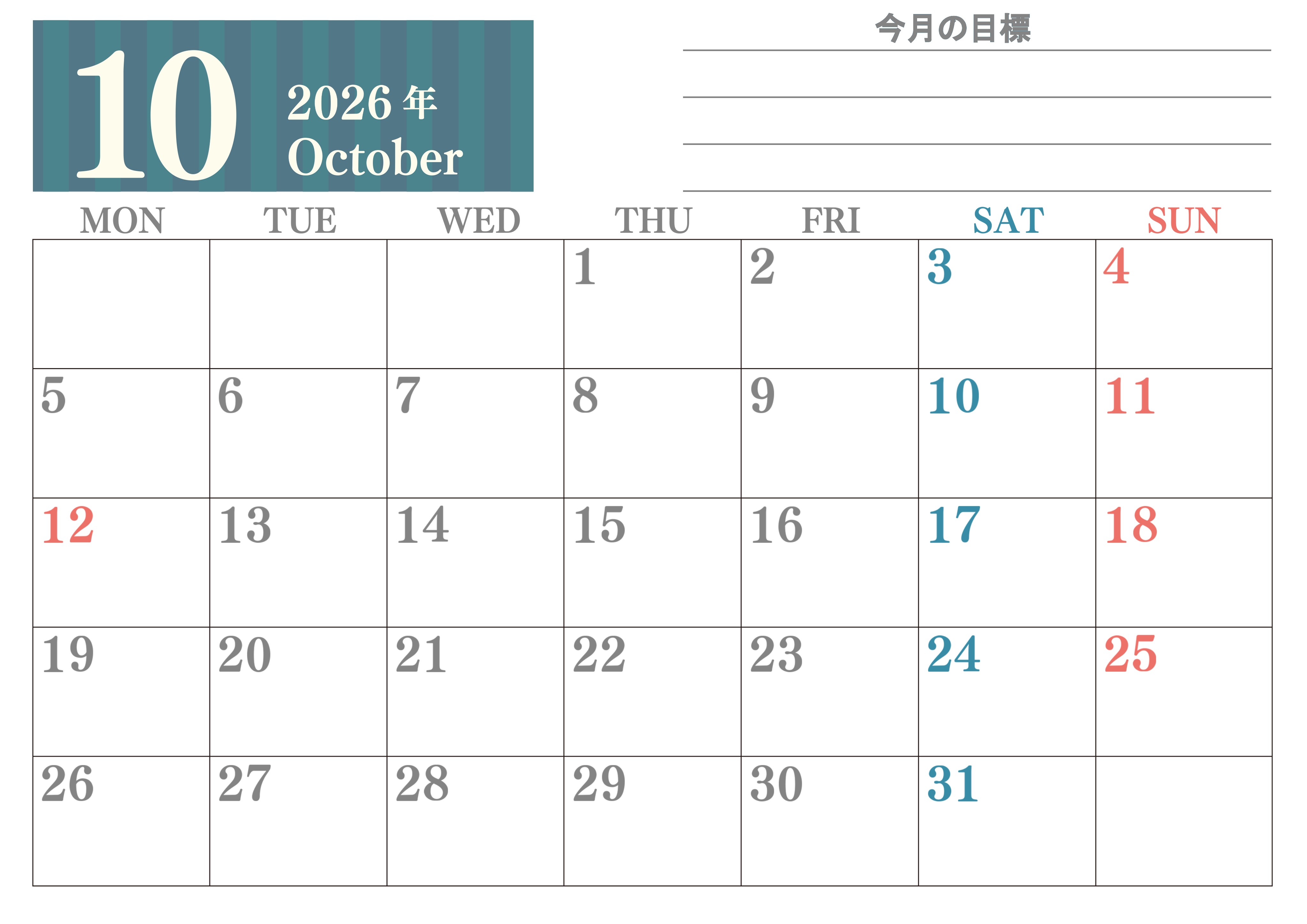 2026年・無料のカレンダーテンプレート 2026年10月カレンダーは横型月曜始まりで季節の行事の絵文字イラストがかわいい♪ダウンロードは無料♪(2026-01541001) 素材状デザイン王 2025年4月13日 2026年10月カレンダーは横型月曜始まりで季節の行事の絵文字イラストがかわいいです。ダウンロードは無料なので継続して使いやすいカレンダーです。(2026-01541001) 10月 横型のカレンダー 月曜始まり 目標 カレンダーデザイン-0154