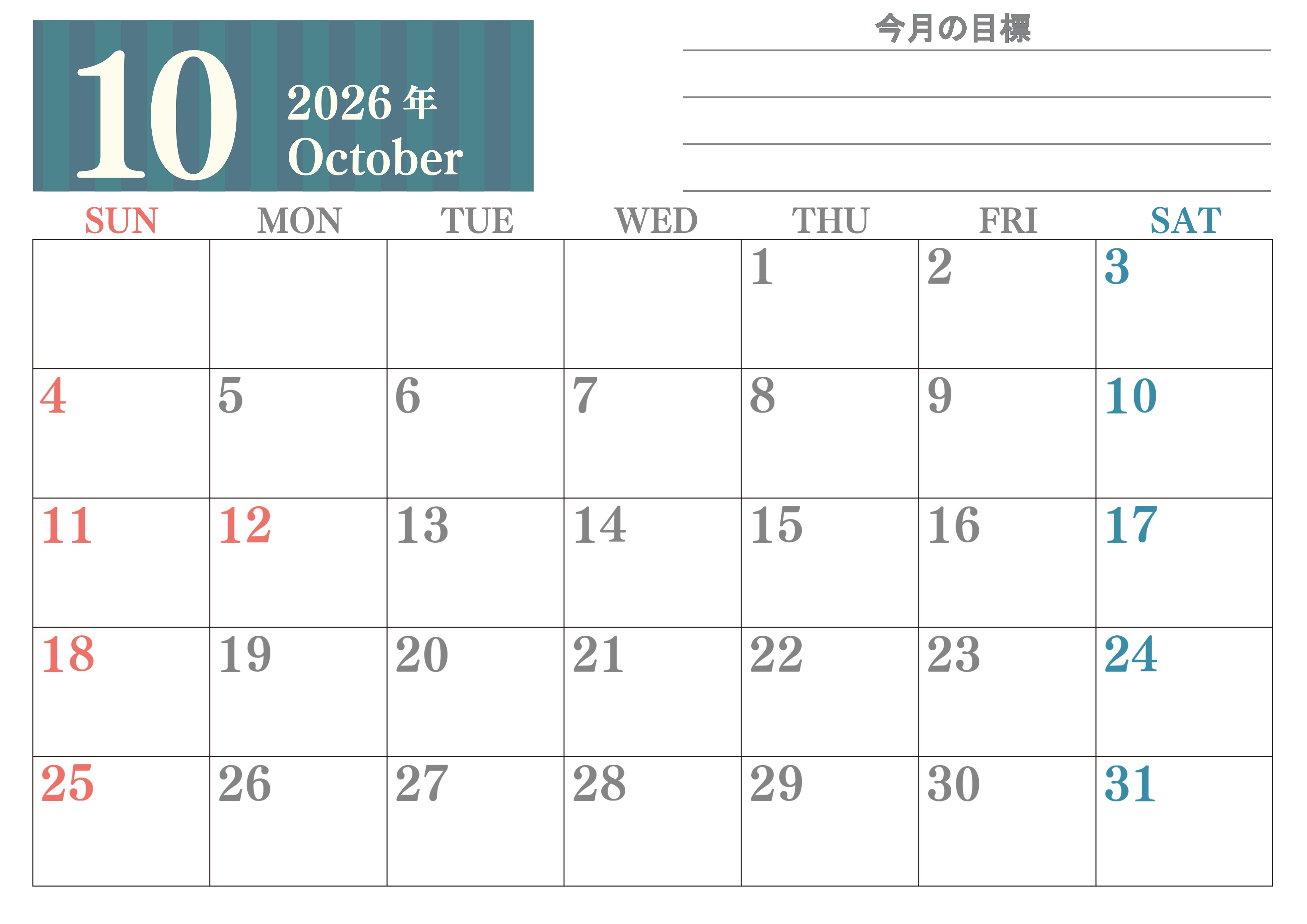 2026年・無料のカレンダーテンプレート 2026年10月カレンダーは横型日曜始まりで季節の行事の絵文字イラストがかわいい♪ダウンロードは無料♪(2026-01541000) 素材状デザイン王 2025年4月13日 2026年10月カレンダーは横型日曜始まりで季節の行事の絵文字イラストがかわいいです。ダウンロードは無料なので継続して使いやすいカレンダーです。(2026-01541000) 10月 横型のカレンダー 日曜始まり 目標 カレンダーデザイン-0154