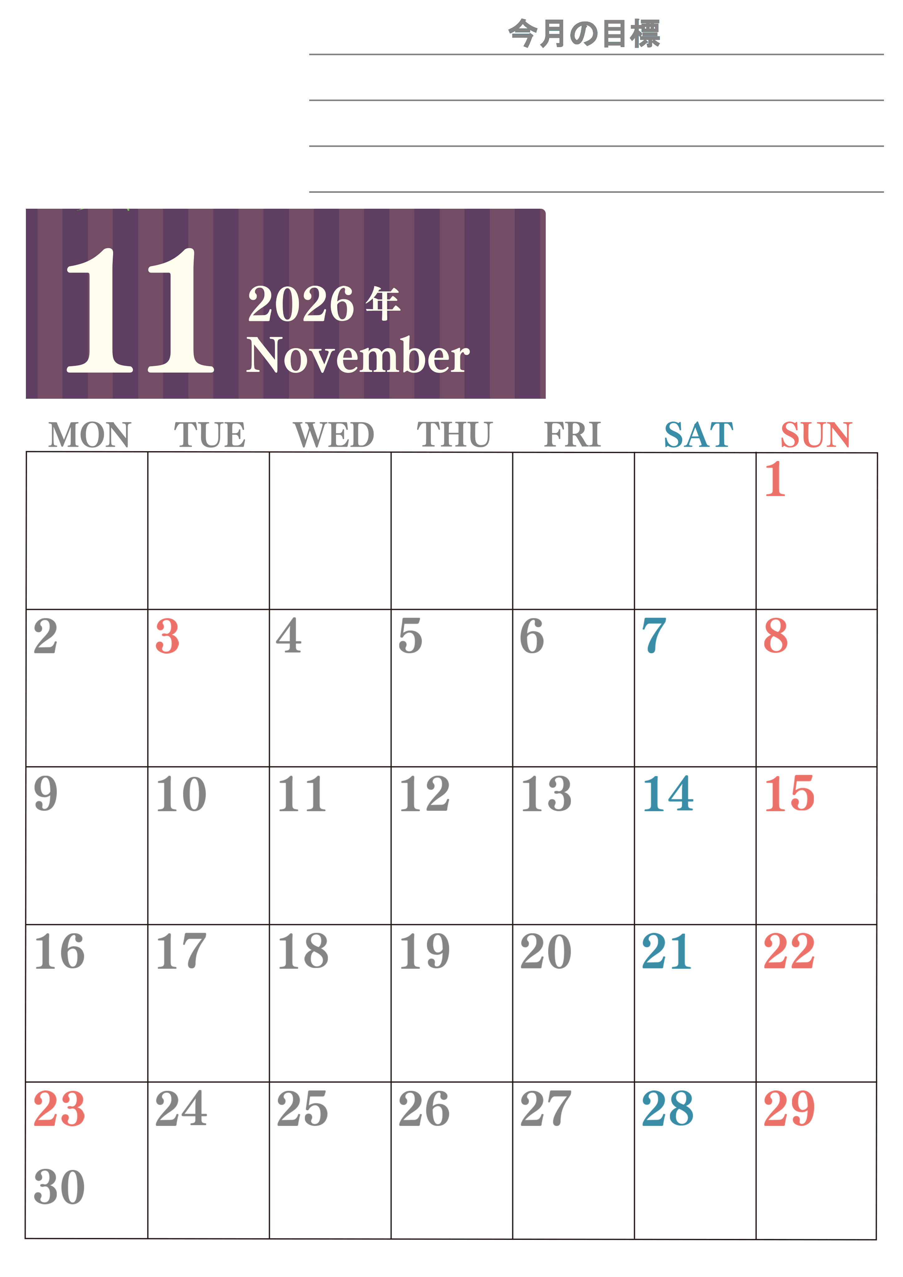 2026年・無料のカレンダーテンプレート 2026年11月カレンダーは縦型月曜始まりで季節の行事の絵文字イラストがかわいい♪ダウンロードは無料♪(2026-01541111) 素材状デザイン王 2025年4月13日 2026年11月カレンダーは縦型月曜始まりで季節の行事の絵文字イラストがかわいいです。ダウンロードは無料なので継続して使いやすいカレンダーです。(2026-01541111) 11月 縦型のカレンダー 月曜始まり 目標 カレンダーデザイン-0154