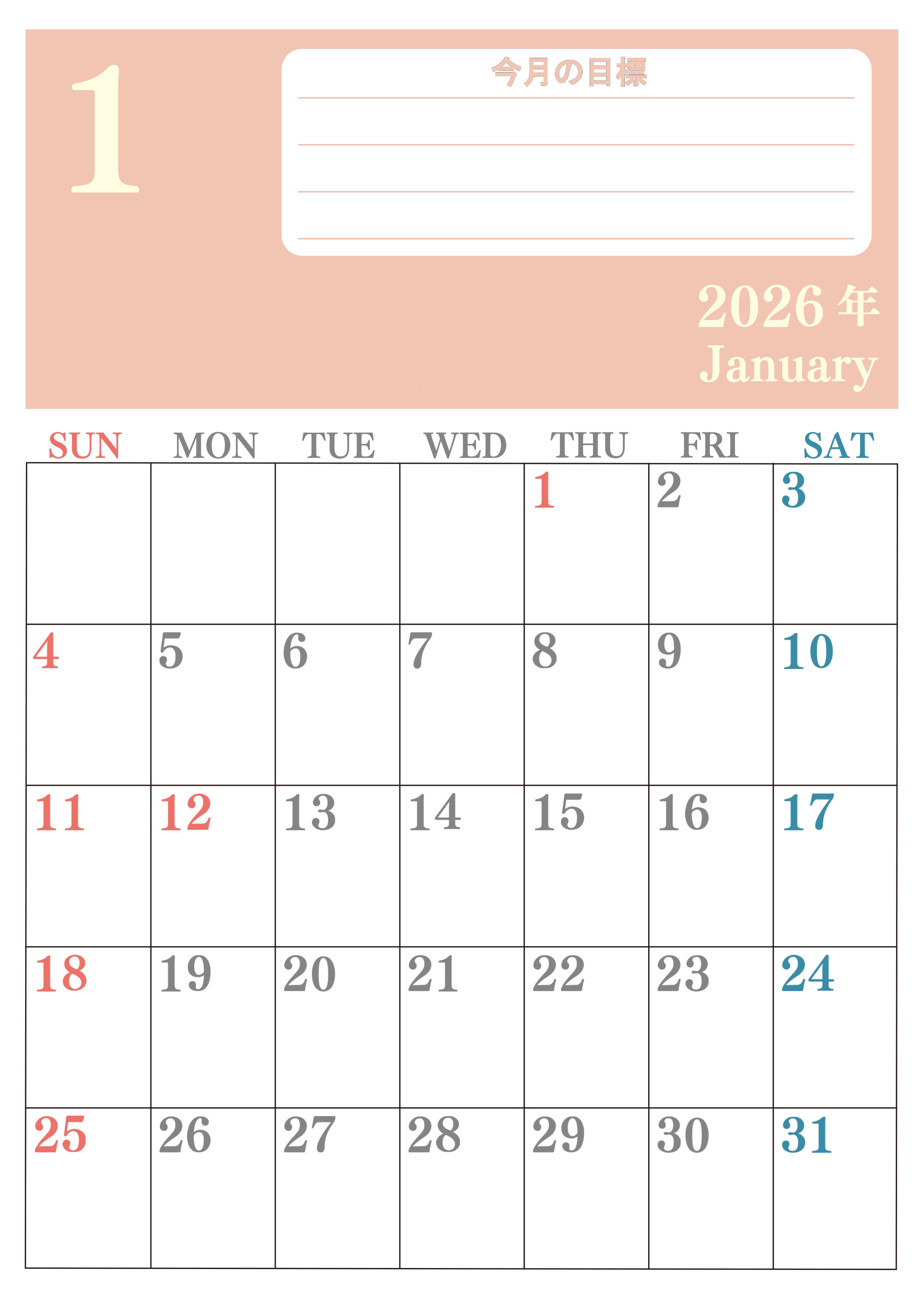 2026年・無料のカレンダーテンプレート 2026年1月カレンダーは縦型日曜始まりで目標を達成する計画を立てるのに使いやすい!ダウンロード無料!(2026-01550110) 素材状デザイン王 2025年4月13日 2026年1月カレンダーは縦型日曜始まりで目標を達成する計画を立てるのに使いやすいです。ダウンロードは簡単に無料にて行えるのでA4用紙に印刷しましょう。(2026-01550110) 1月 縦型のカレンダー 日曜始まり 目標 カレンダーデザイン-0155