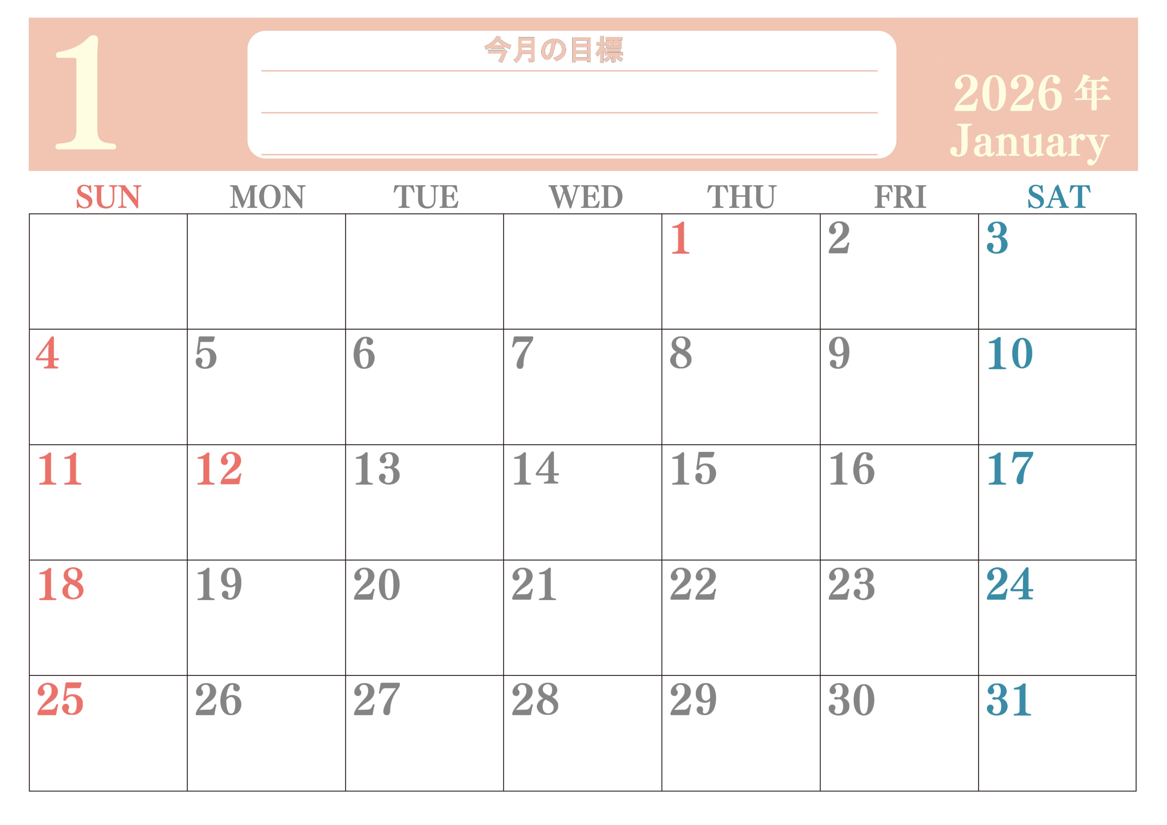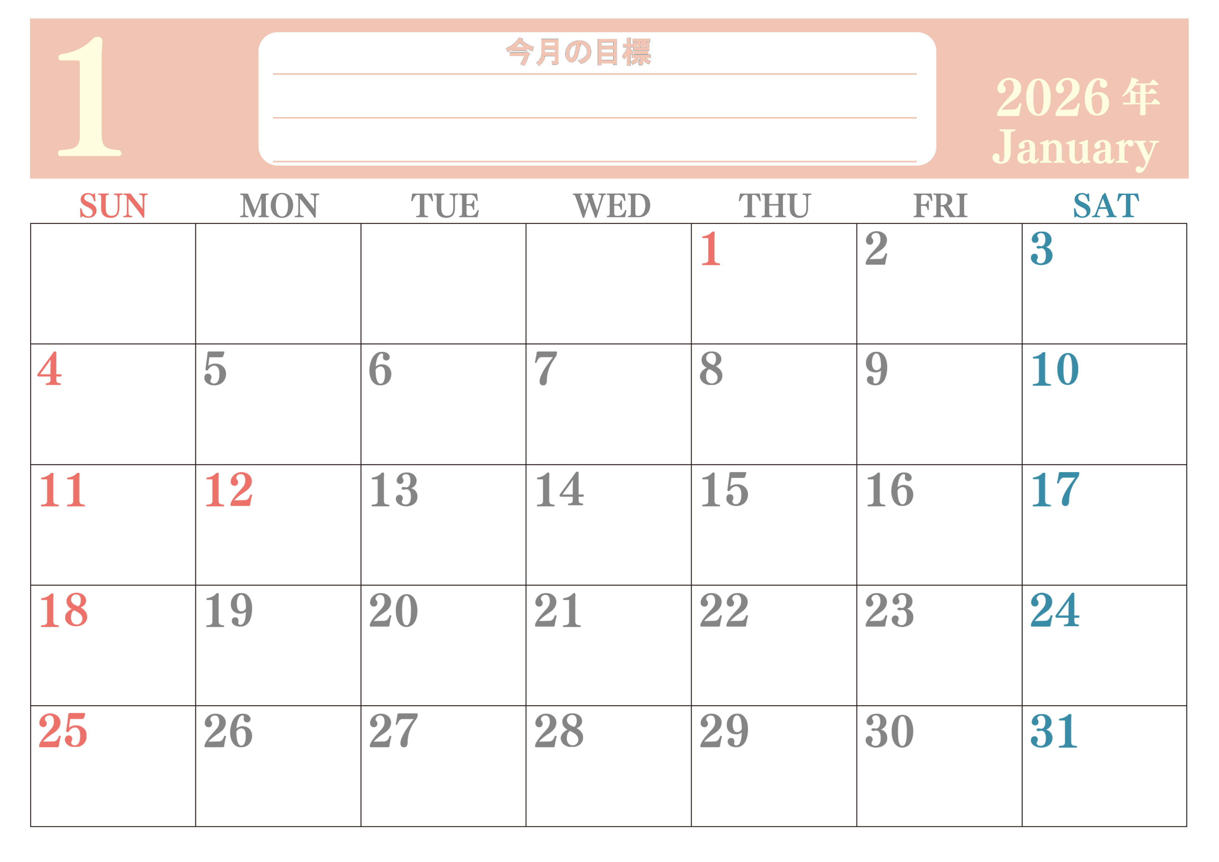 2026年1月カレンダーは横型日曜始まりで目標を達成する計画を立てるのに使いやすいです。ダウンロードは簡単に無料にて行えるのでA4用紙に印刷しましょう。(2026-01550100)