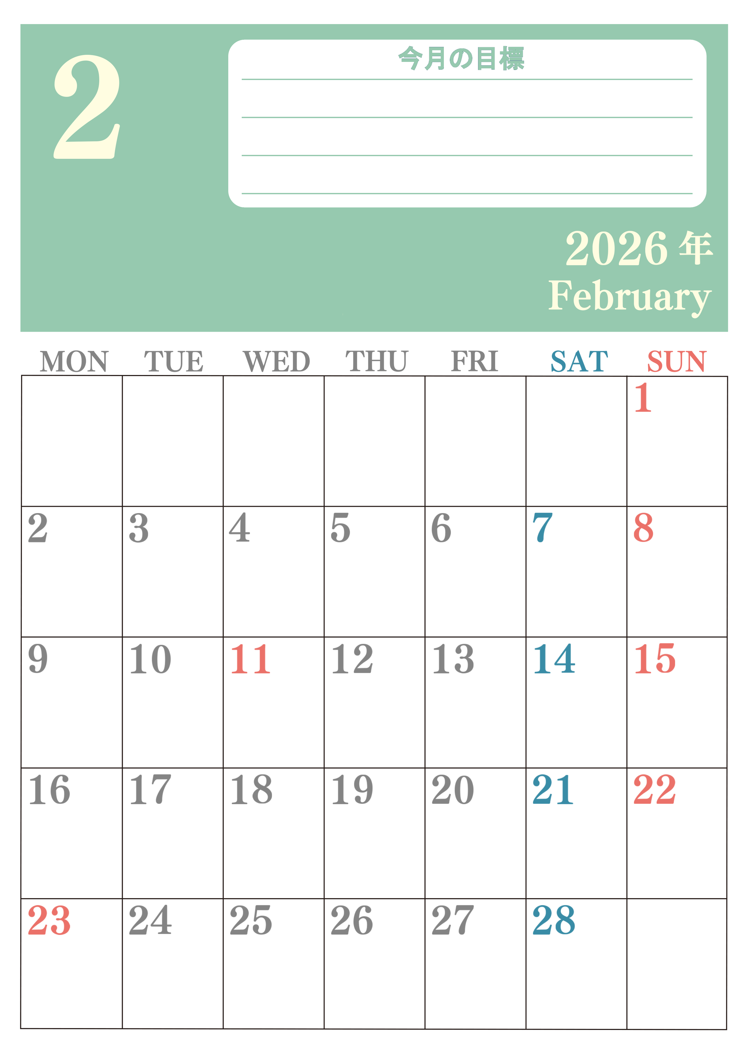 2026年・無料のカレンダーテンプレート 2026年2月カレンダーは縦型月曜始まりで目標を達成する計画を立てるのに使いやすい!ダウンロード無料!(2026-01550211) 素材状デザイン王 2025年4月13日 2026年2月カレンダーは縦型月曜始まりで目標を達成する計画を立てるのに使いやすいです。ダウンロードは簡単に無料にて行えるのでA4用紙に印刷しましょう。(2026-01550211) 2月 縦型のカレンダー 月曜始まり 目標 カレンダーデザイン-0155