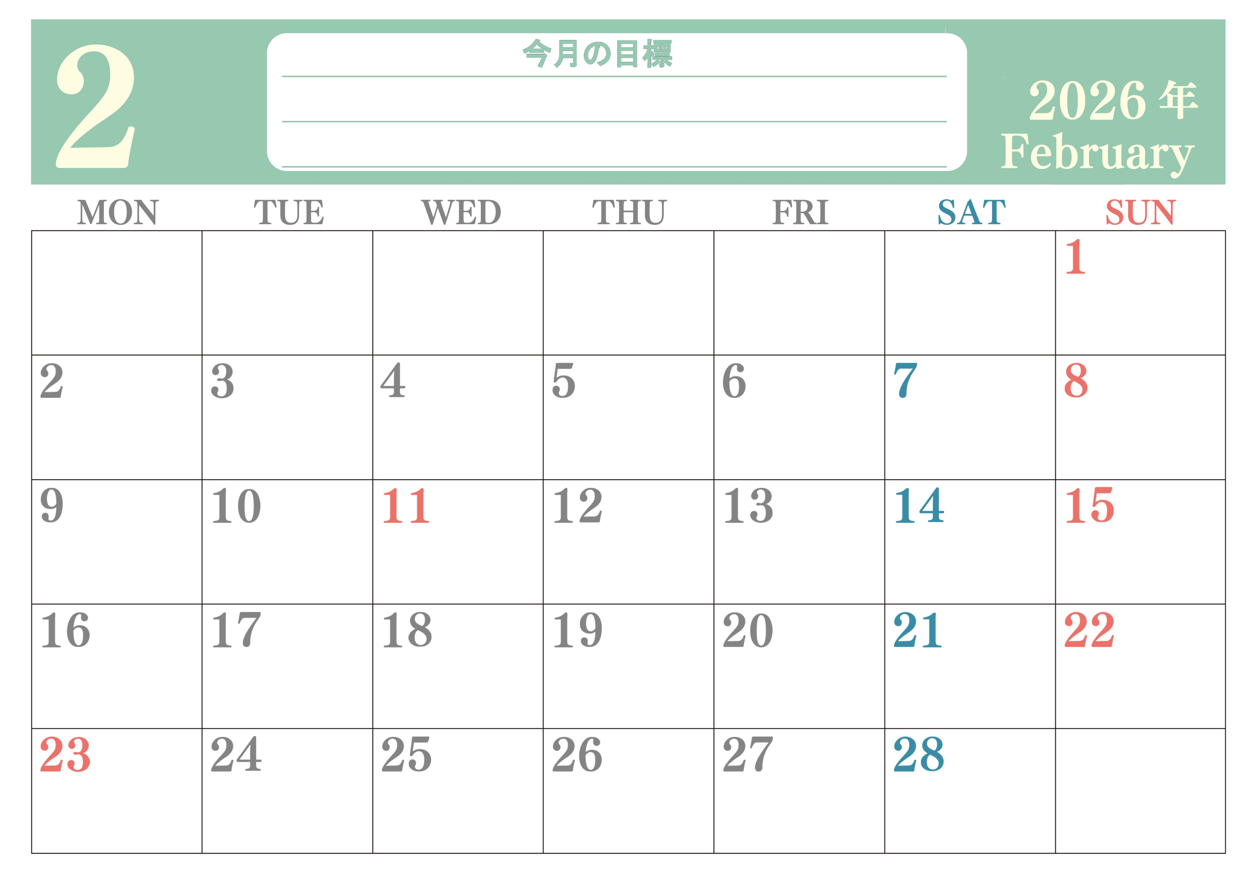 2026年・無料のカレンダーテンプレート 2026年2月カレンダーは横型月曜始まりで目標を達成する計画を立てるのに使いやすい!ダウンロード無料!(2026-01550201) 素材状デザイン王 2025年4月13日 2026年2月カレンダーは横型月曜始まりで目標を達成する計画を立てるのに使いやすいです。ダウンロードは簡単に無料にて行えるのでA4用紙に印刷しましょう。(2026-01550201) 2月 横型のカレンダー 月曜始まり 目標 カレンダーデザイン-0155