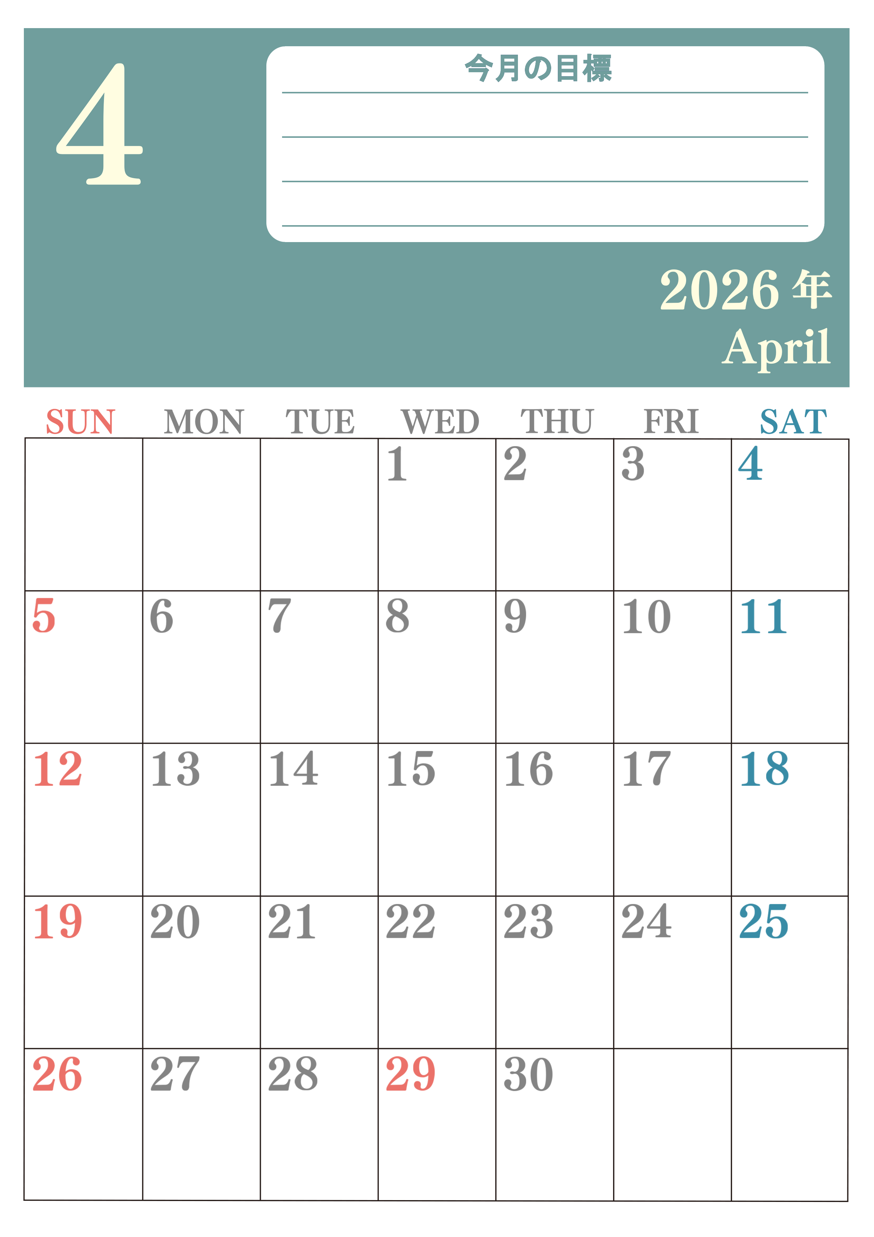 2026年・無料のカレンダーテンプレート 2026年4月カレンダーは縦型日曜始まりで目標を達成する計画を立てるのに使いやすい!ダウンロード無料!(2026-01550410) 素材状デザイン王 2025年4月13日 2026年4月カレンダーは縦型日曜始まりで目標を達成する計画を立てるのに使いやすいです。ダウンロードは簡単に無料にて行えるのでA4用紙に印刷しましょう。(2026-01550410) 4月 縦型のカレンダー 日曜始まり 目標 カレンダーデザイン-0155