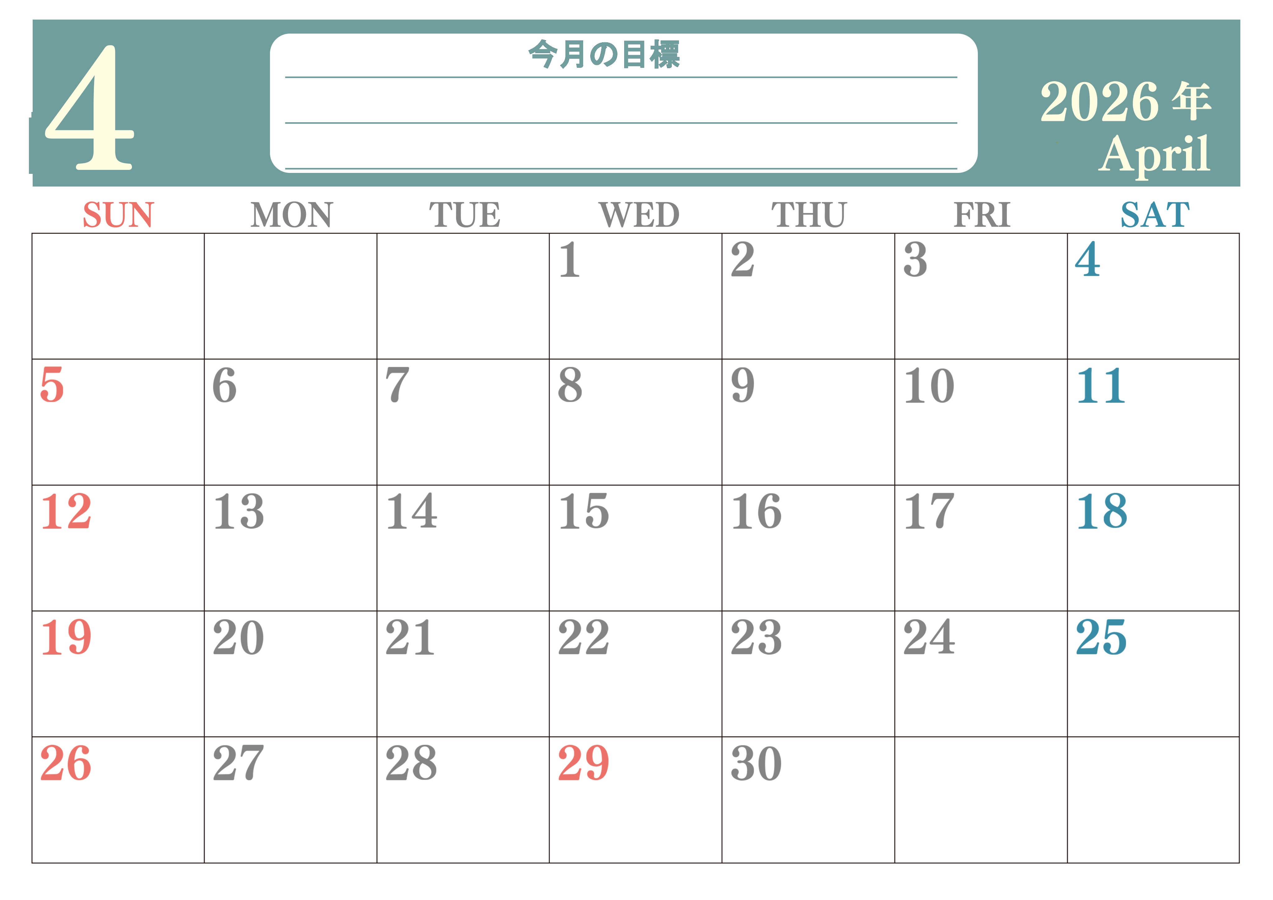 2026年・無料のカレンダーテンプレート 2026年4月カレンダーは横型日曜始まりで目標を達成する計画を立てるのに使いやすい!ダウンロード無料!(2026-01550400) 素材状デザイン王 2025年4月13日 2026年4月カレンダーは横型日曜始まりで目標を達成する計画を立てるのに使いやすいです。ダウンロードは簡単に無料にて行えるのでA4用紙に印刷しましょう。(2026-01550400) 4月 横型のカレンダー 日曜始まり 目標 カレンダーデザイン-0155