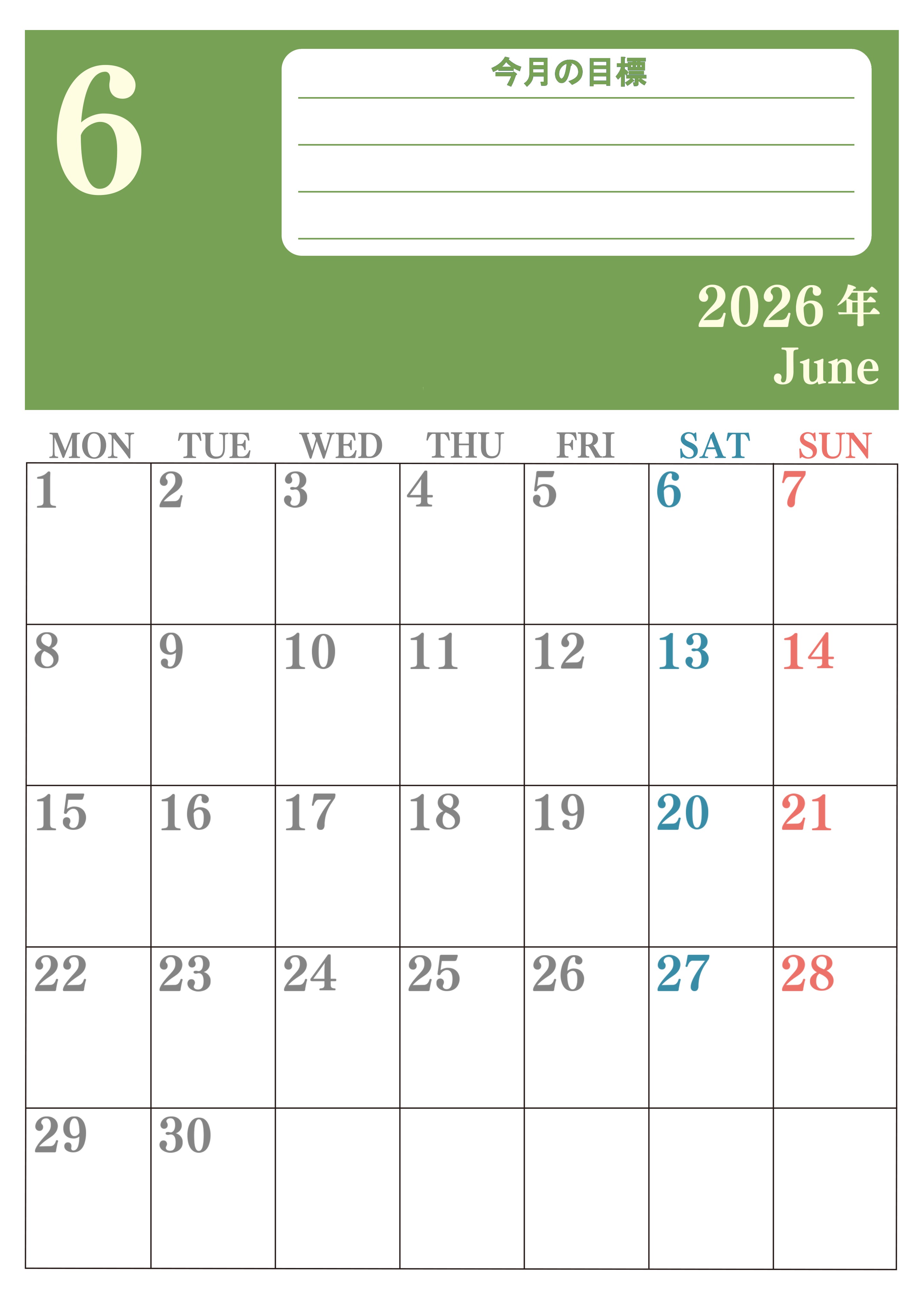 2026年・無料のカレンダーテンプレート 2026年6月カレンダーは縦型月曜始まりで目標を達成する計画を立てるのに使いやすい!ダウンロード無料!(2026-01550611) 素材状デザイン王 2025年4月13日 2026年6月カレンダーは縦型月曜始まりで目標を達成する計画を立てるのに使いやすいです。ダウンロードは簡単に無料にて行えるのでA4用紙に印刷しましょう。(2026-01550611) 6月 縦型のカレンダー 月曜始まり 目標 カレンダーデザイン-0155