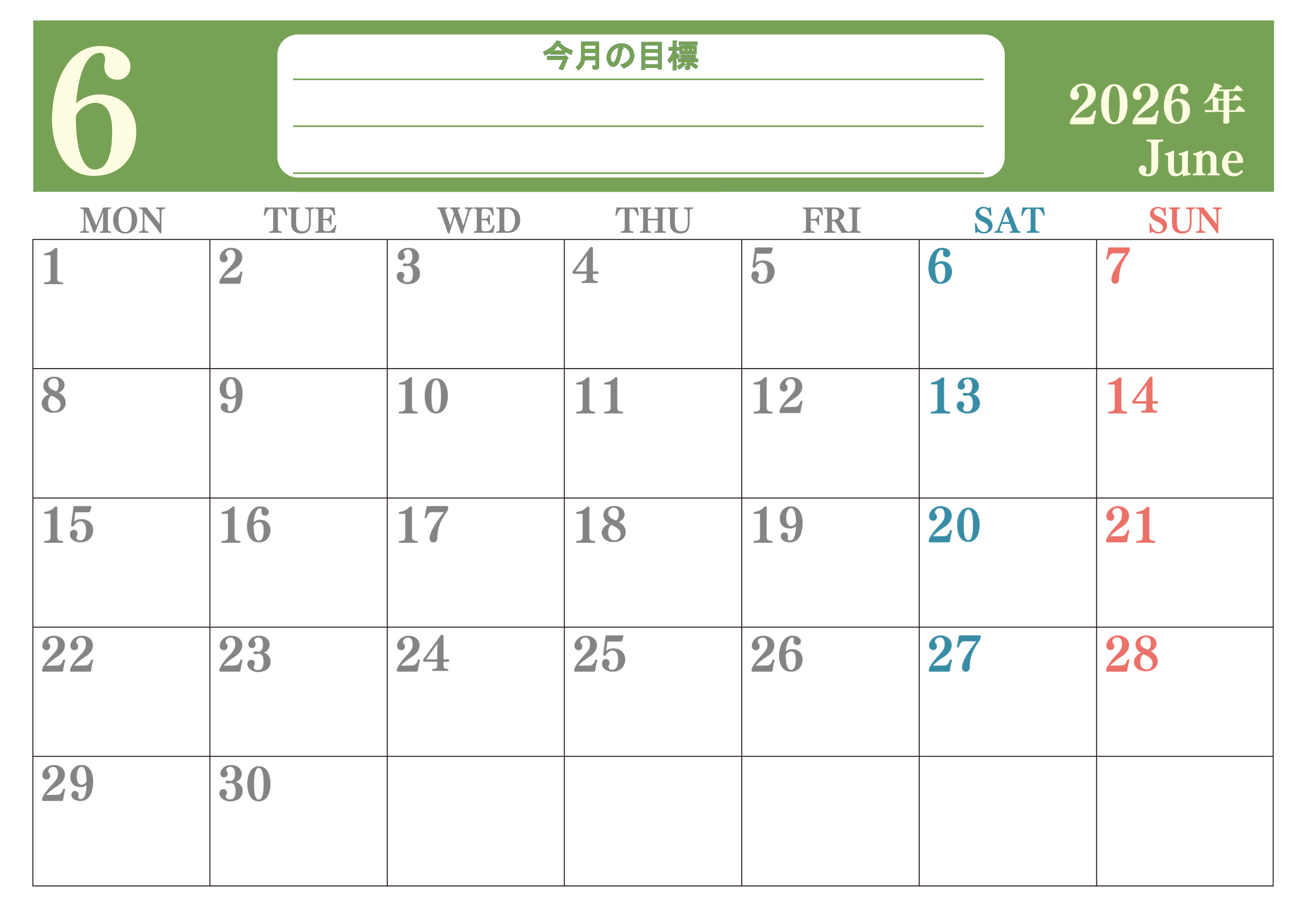 2026年・無料のカレンダーテンプレート 2026年6月カレンダーは横型月曜始まりで目標を達成する計画を立てるのに使いやすい!ダウンロード無料!(2026-01550601) 素材状デザイン王 2025年4月13日 2026年6月カレンダーは横型月曜始まりで目標を達成する計画を立てるのに使いやすいです。ダウンロードは簡単に無料にて行えるのでA4用紙に印刷しましょう。(2026-01550601) 6月 横型のカレンダー 月曜始まり 目標 カレンダーデザイン-0155