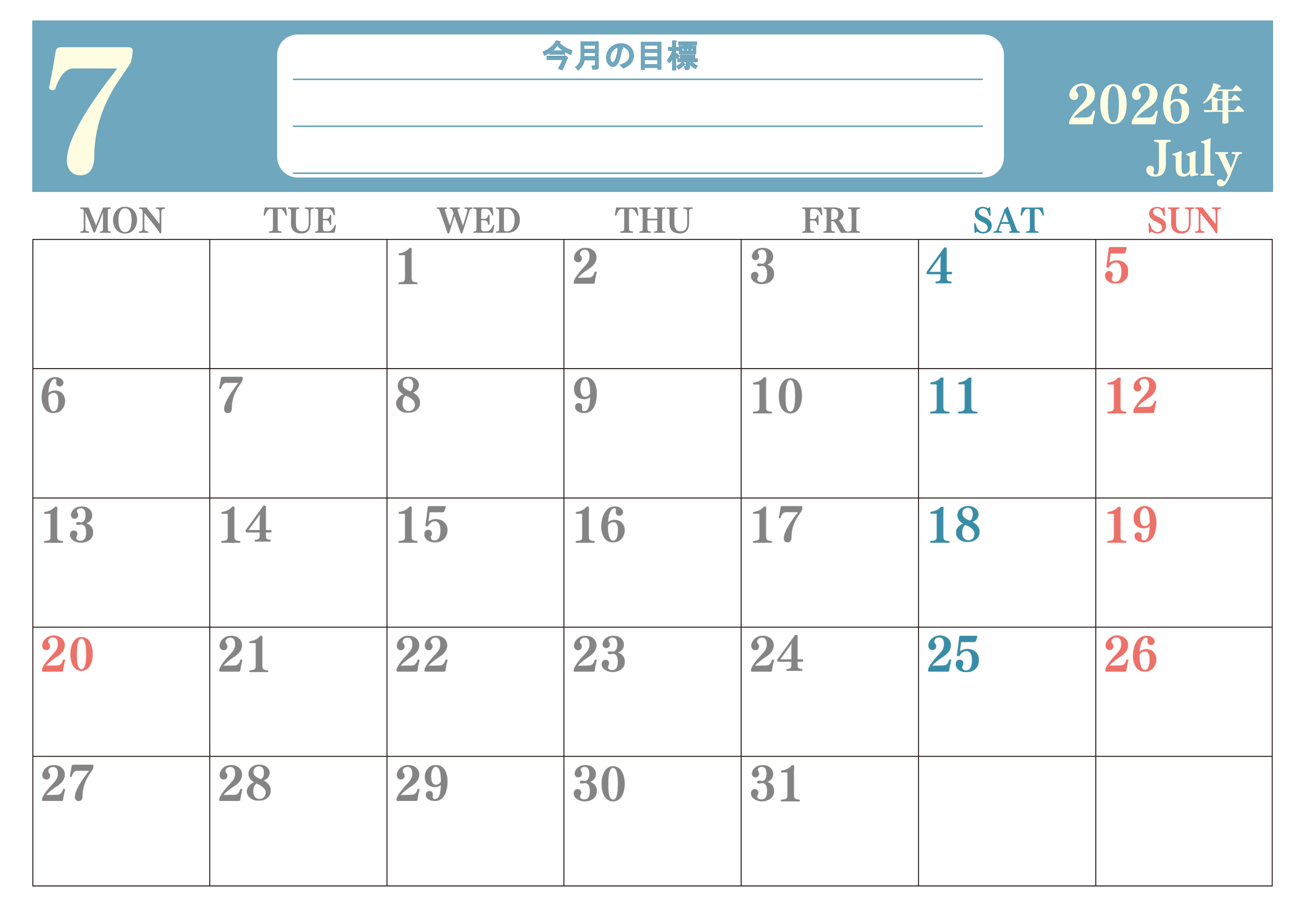 2026年7月カレンダーは横型月曜始まりで目標を達成する計画を立てるのに使いやすいです。ダウンロードは簡単に無料にて行えるのでA4用紙に印刷しましょう。(2026-01550701)