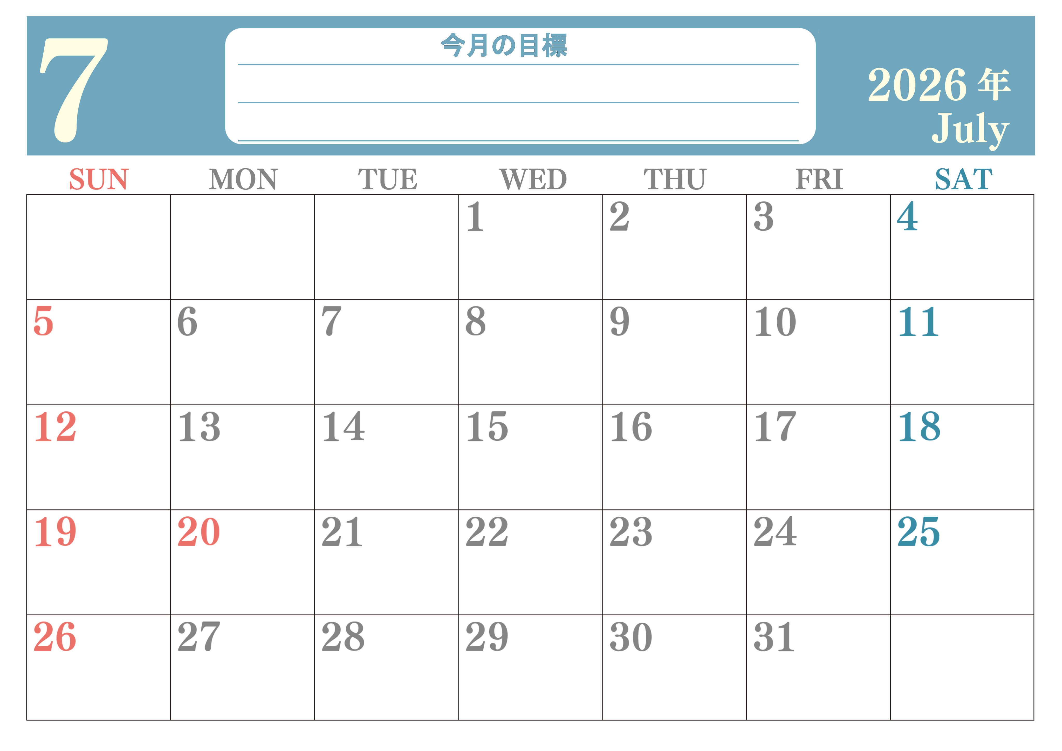 2026年7月カレンダーは横型日曜始まりで目標を達成する計画を立てるのに使いやすいです。ダウンロードは簡単に無料にて行えるのでA4用紙に印刷しましょう。(2026-01550700)