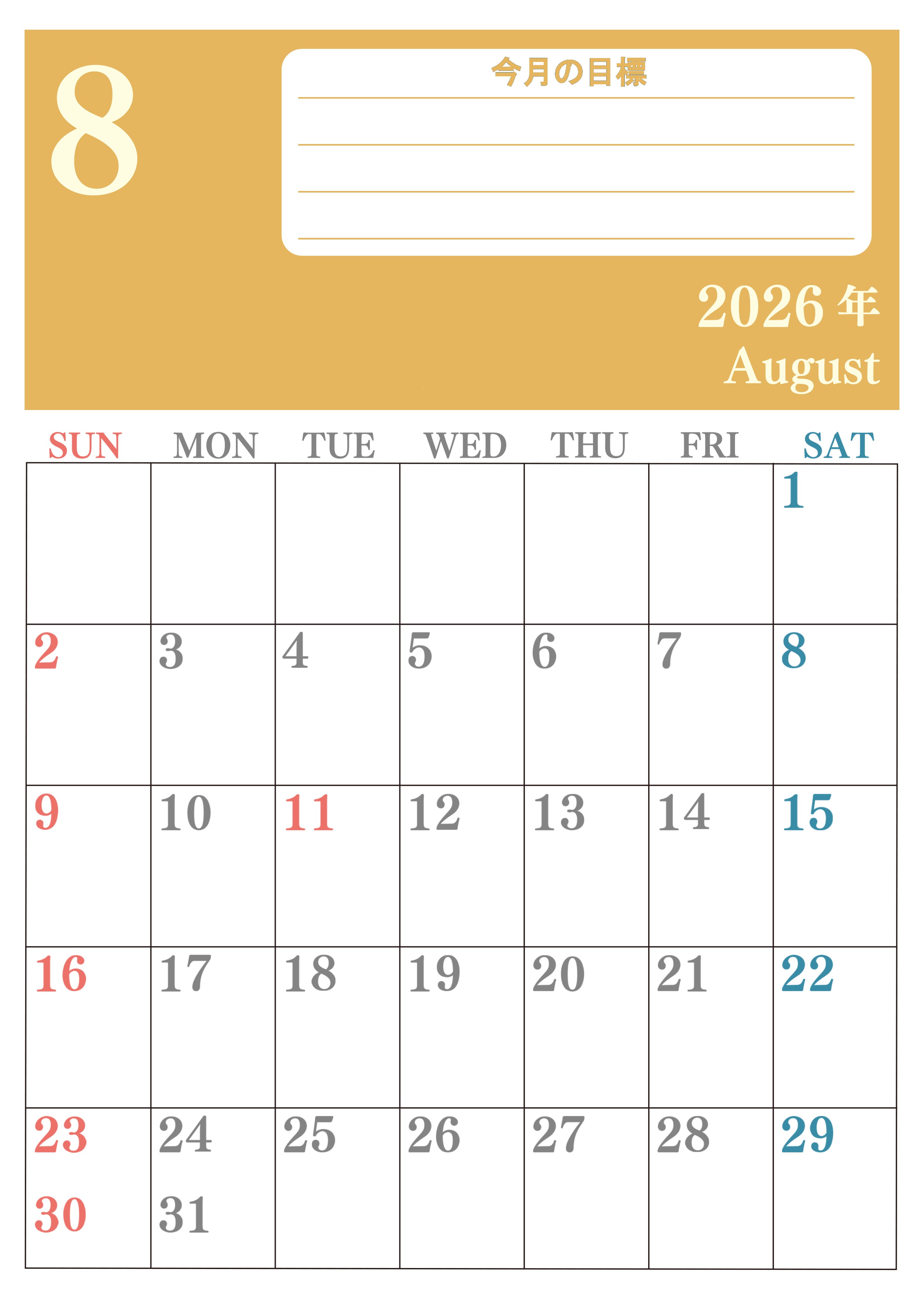 2026年8月カレンダーは縦型日曜始まりで目標を達成する計画を立てるのに使いやすいです。ダウンロードは簡単に無料にて行えるのでA4用紙に印刷しましょう。(2026-01550810)