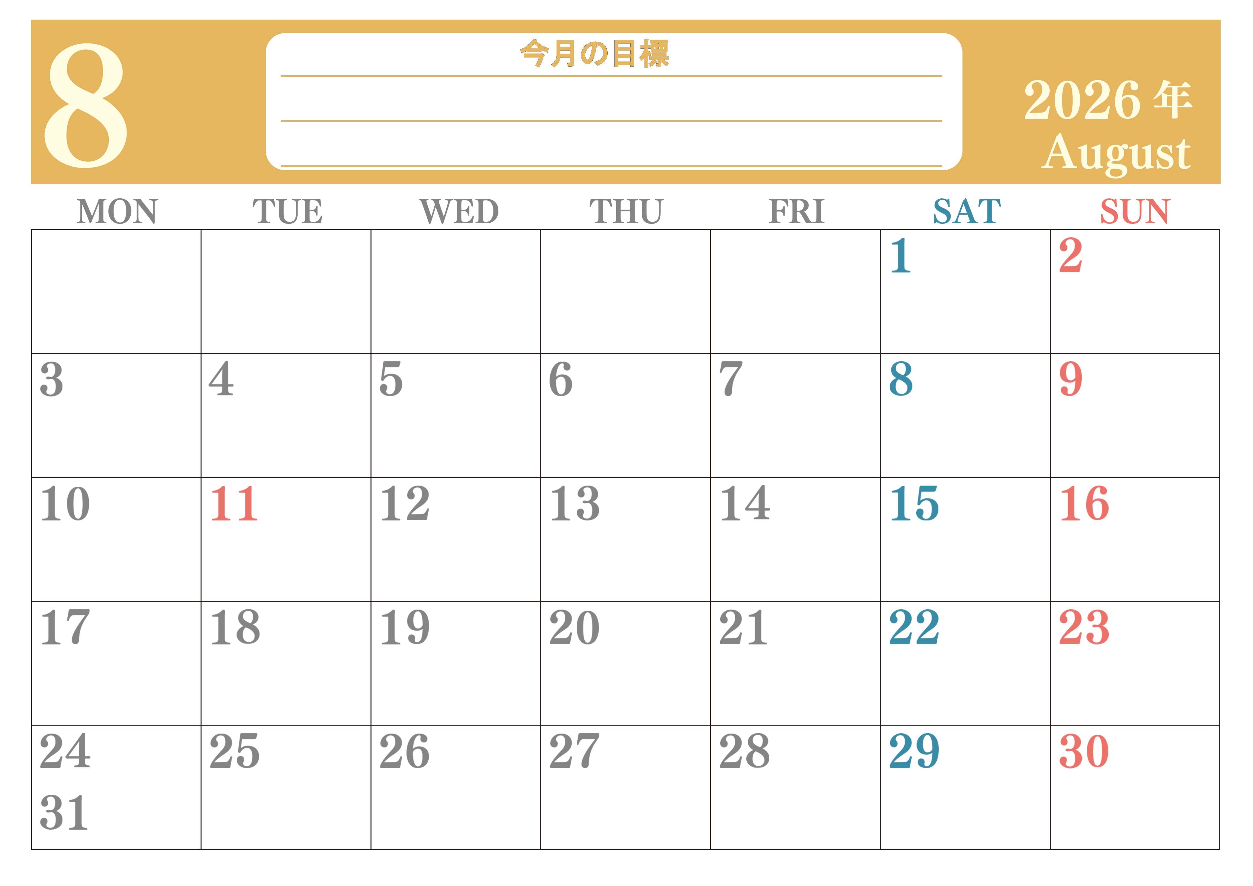 2026年・無料のカレンダーテンプレート 2026年8月カレンダーは横型月曜始まりで目標を達成する計画を立てるのに使いやすい!ダウンロード無料!(2026-01550801) 素材状デザイン王 2025年4月13日 2026年8月カレンダーは横型月曜始まりで目標を達成する計画を立てるのに使いやすいです。ダウンロードは簡単に無料にて行えるのでA4用紙に印刷しましょう。(2026-01550801) 8月 横型のカレンダー 月曜始まり 目標 カレンダーデザイン-0155