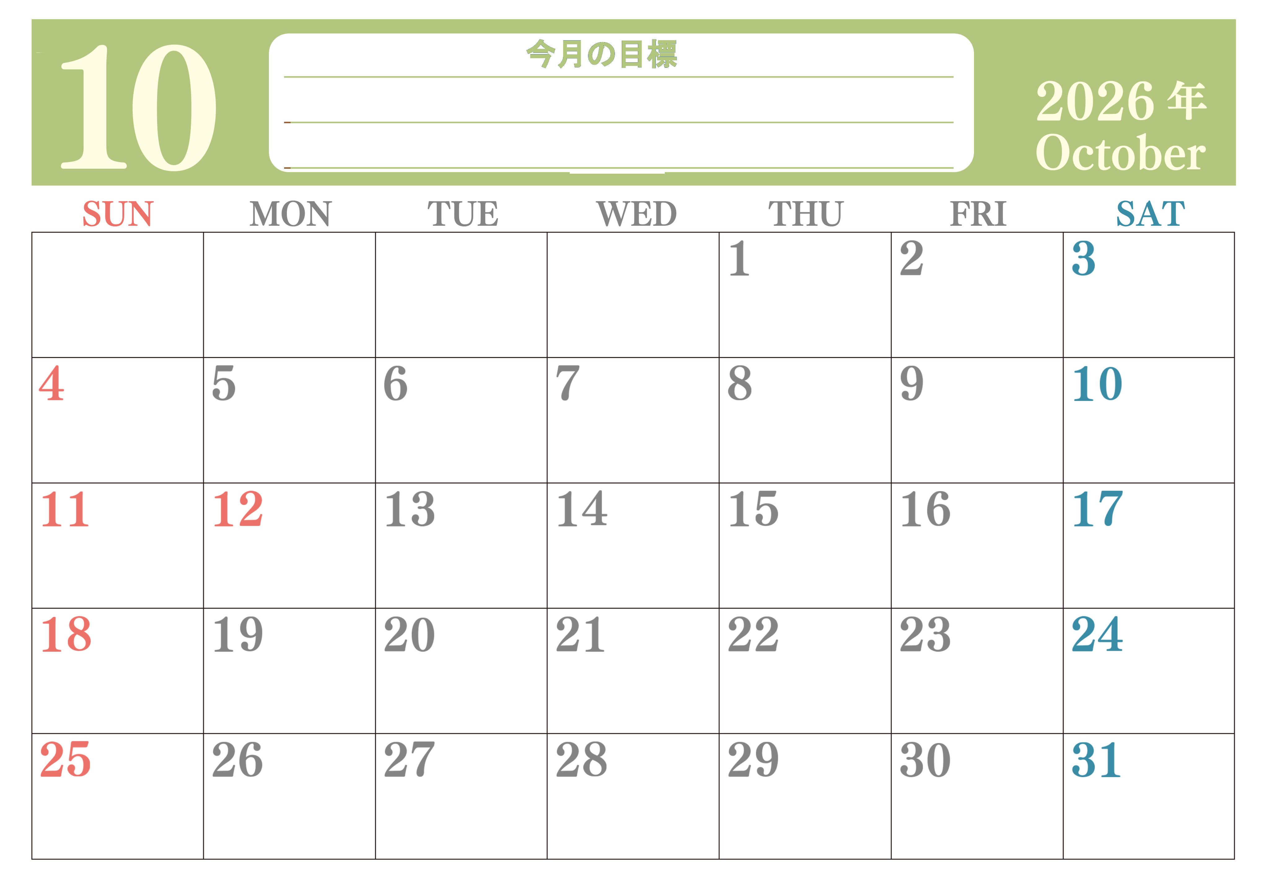 2026年10月カレンダーは横型日曜始まりで目標を達成する計画を立てるのに使いやすいです。ダウンロードは簡単に無料にて行えるのでA4用紙に印刷しましょう。(2026-01551000)