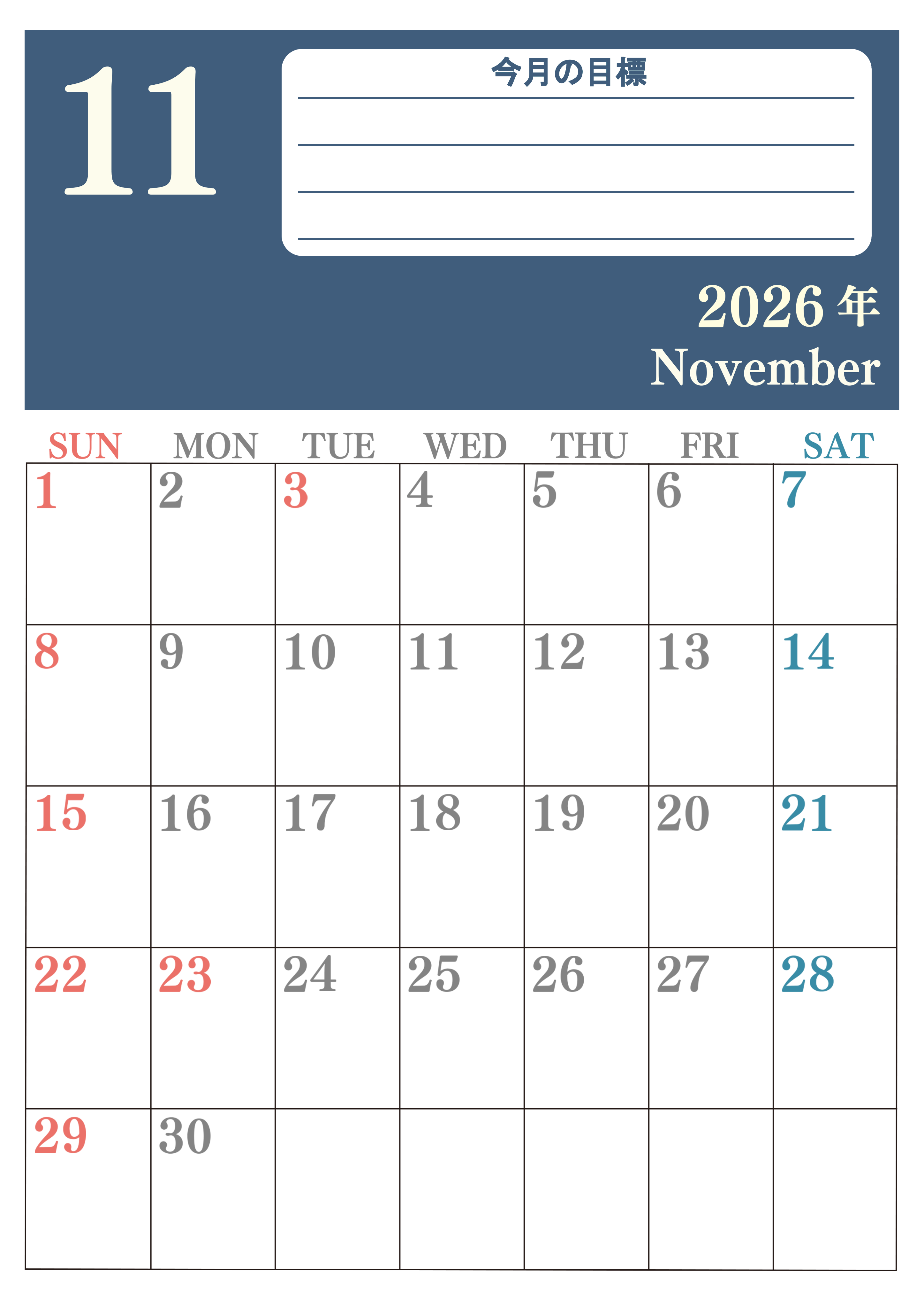 2026年・無料のカレンダーテンプレート 2026年11月カレンダーは縦型日曜始まりで目標を達成する計画を立てるのに使いやすい!ダウンロード無料!(2026-01551110) 素材状デザイン王 2025年4月13日 2026年11月カレンダーは縦型日曜始まりで目標を達成する計画を立てるのに使いやすいです。ダウンロードは簡単に無料にて行えるのでA4用紙に印刷しましょう。(2026-01551110) 11月 縦型のカレンダー 日曜始まり 目標 カレンダーデザイン-0155