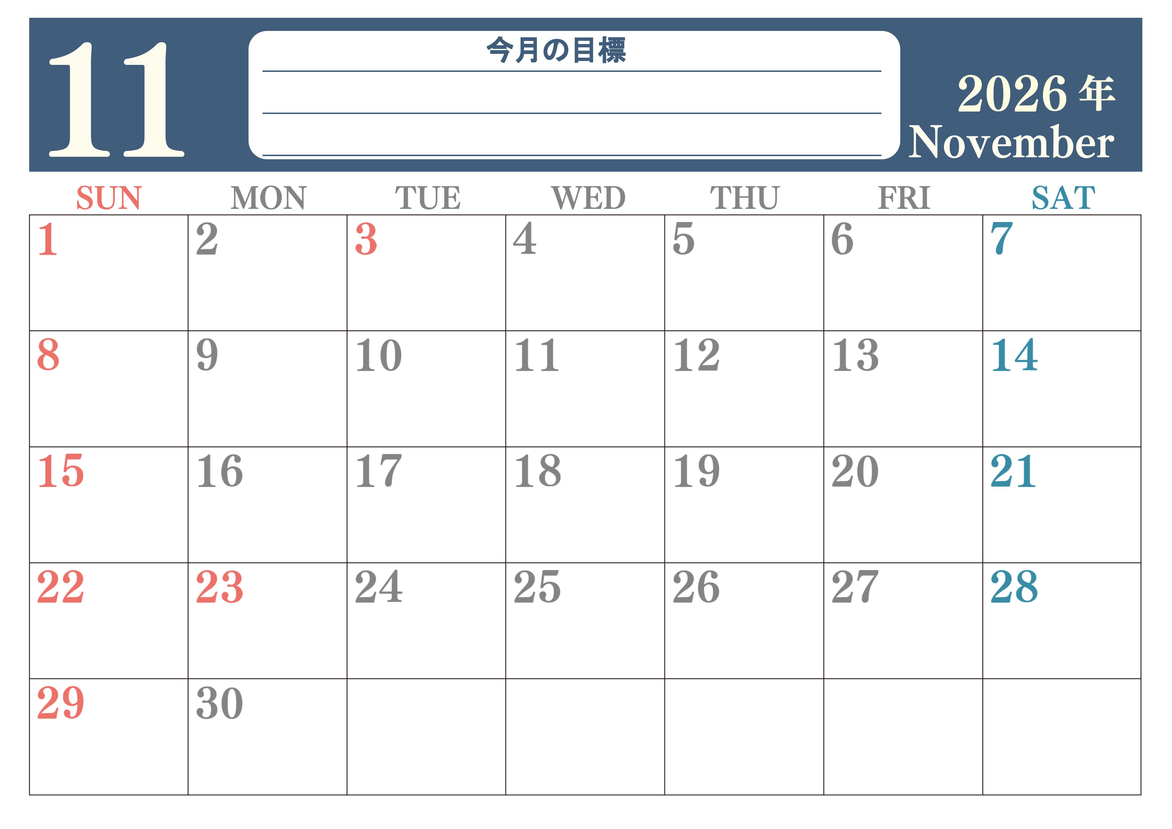 2026年11月カレンダーは横型日曜始まりで目標を達成する計画を立てるのに使いやすいです。ダウンロードは簡単に無料にて行えるのでA4用紙に印刷しましょう。(2026-01551100)