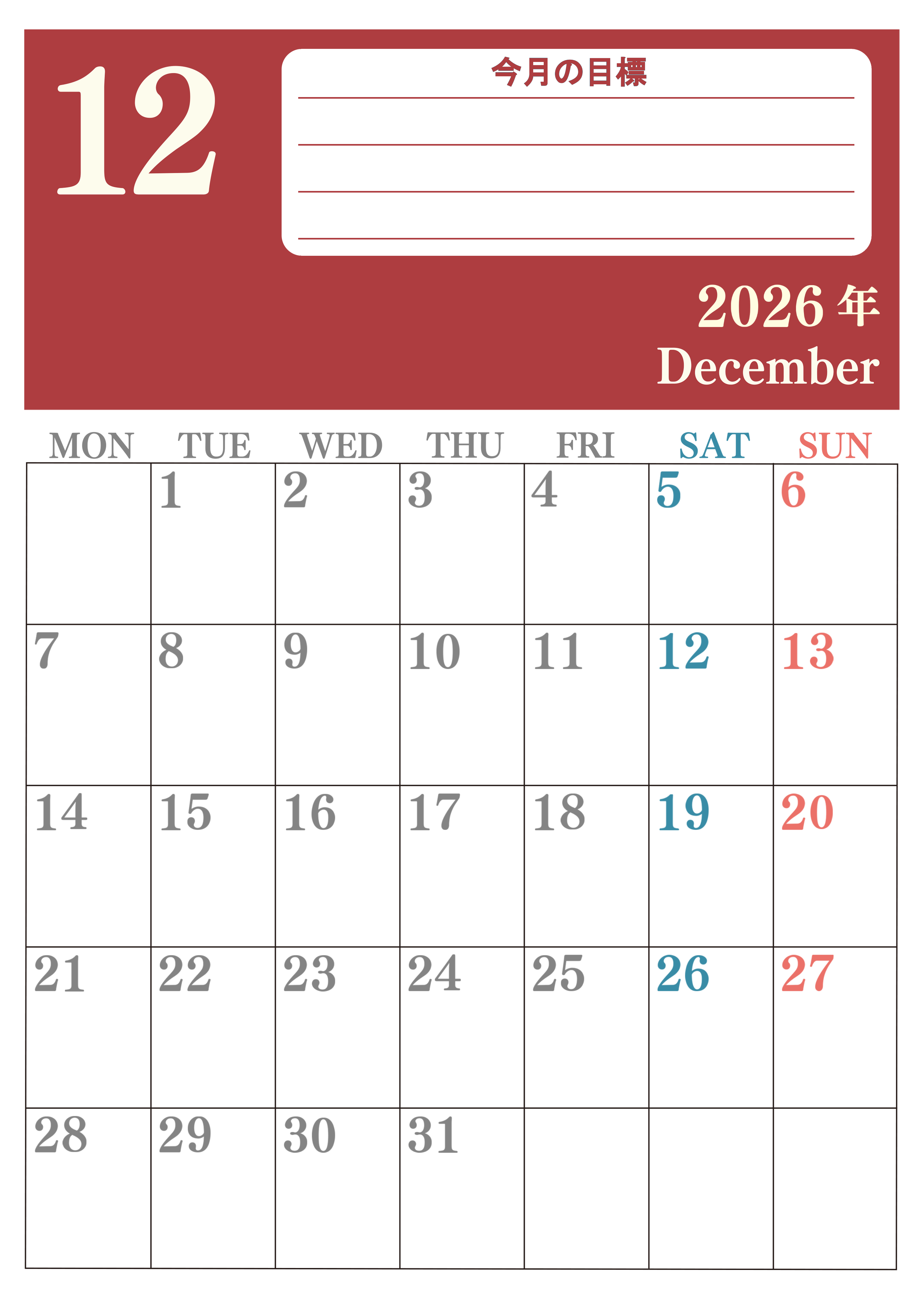 2026年・無料のカレンダーテンプレート 2026年12月カレンダーは縦型月曜始まりで目標を達成する計画を立てるのに使いやすい!ダウンロード無料!(2026-01551211) 素材状デザイン王 2025年4月13日 2026年12月カレンダーは縦型月曜始まりで目標を達成する計画を立てるのに使いやすいです。ダウンロードは簡単に無料にて行えるのでA4用紙に印刷しましょう。(2026-01551211) 12月 縦型のカレンダー 月曜始まり 目標 カレンダーデザイン-0155