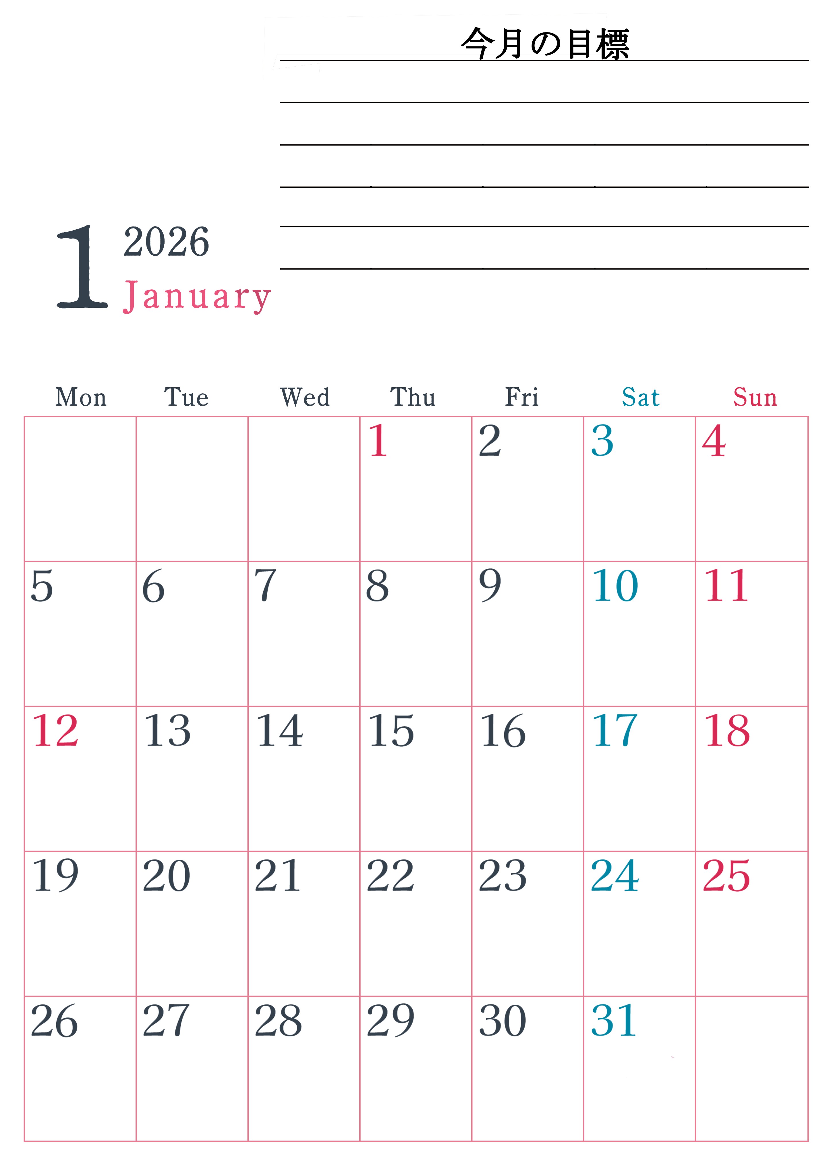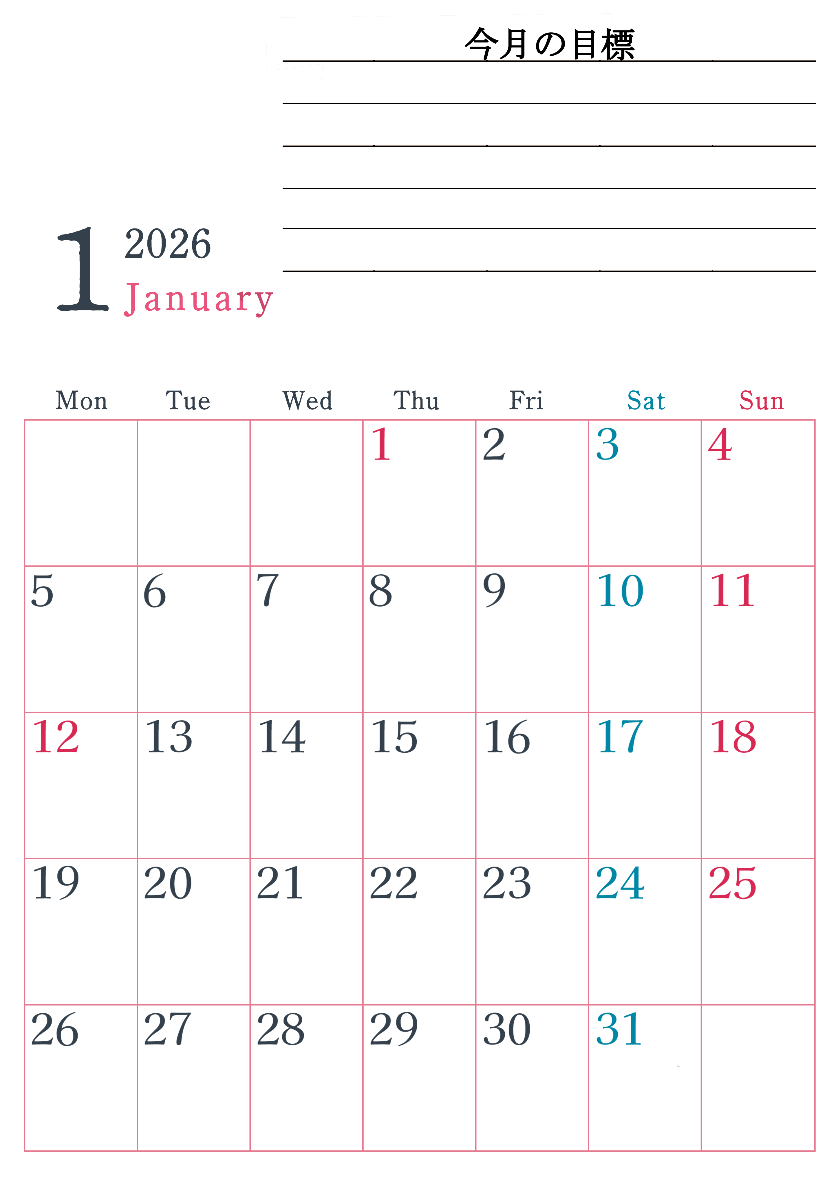 2026年・無料のカレンダーテンプレート 2026年1月カレンダーは縦型月曜始まりで目標設定欄あり♪習慣の継続につながる無料素材(A4)(2026-01560111) 素材状デザイン王 2025年4月13日 2026年1月カレンダーは縦型月曜始まりで目標設定欄があります。習慣の継続につながる無料の素材なのでダウンロードを気軽に行えます。A4用紙に印刷をして計画を書き込みましょう。(2026-01560111) 1月 縦型のカレンダー 月曜始まり 目標 カレンダーデザイン-0156