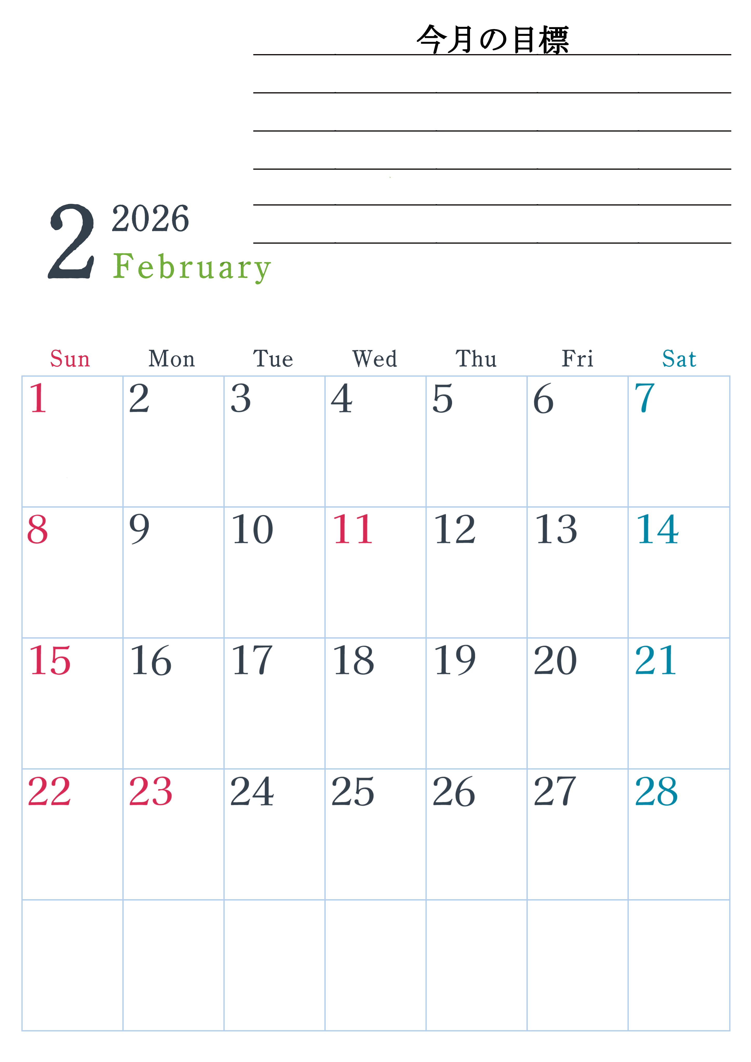 2026年・無料のカレンダーテンプレート 2026年2月カレンダーは縦型日曜始まりで目標設定欄あり♪習慣の継続につながる無料素材(A4)(2026-01560210) 素材状デザイン王 2025年4月13日 2026年2月カレンダーは縦型日曜始まりで目標設定欄があります。習慣の継続につながる無料の素材なのでダウンロードを気軽に行えます。A4用紙に印刷をして計画を書き込みましょう。(2026-01560210) 2月 縦型のカレンダー 日曜始まり 目標 カレンダーデザイン-0156