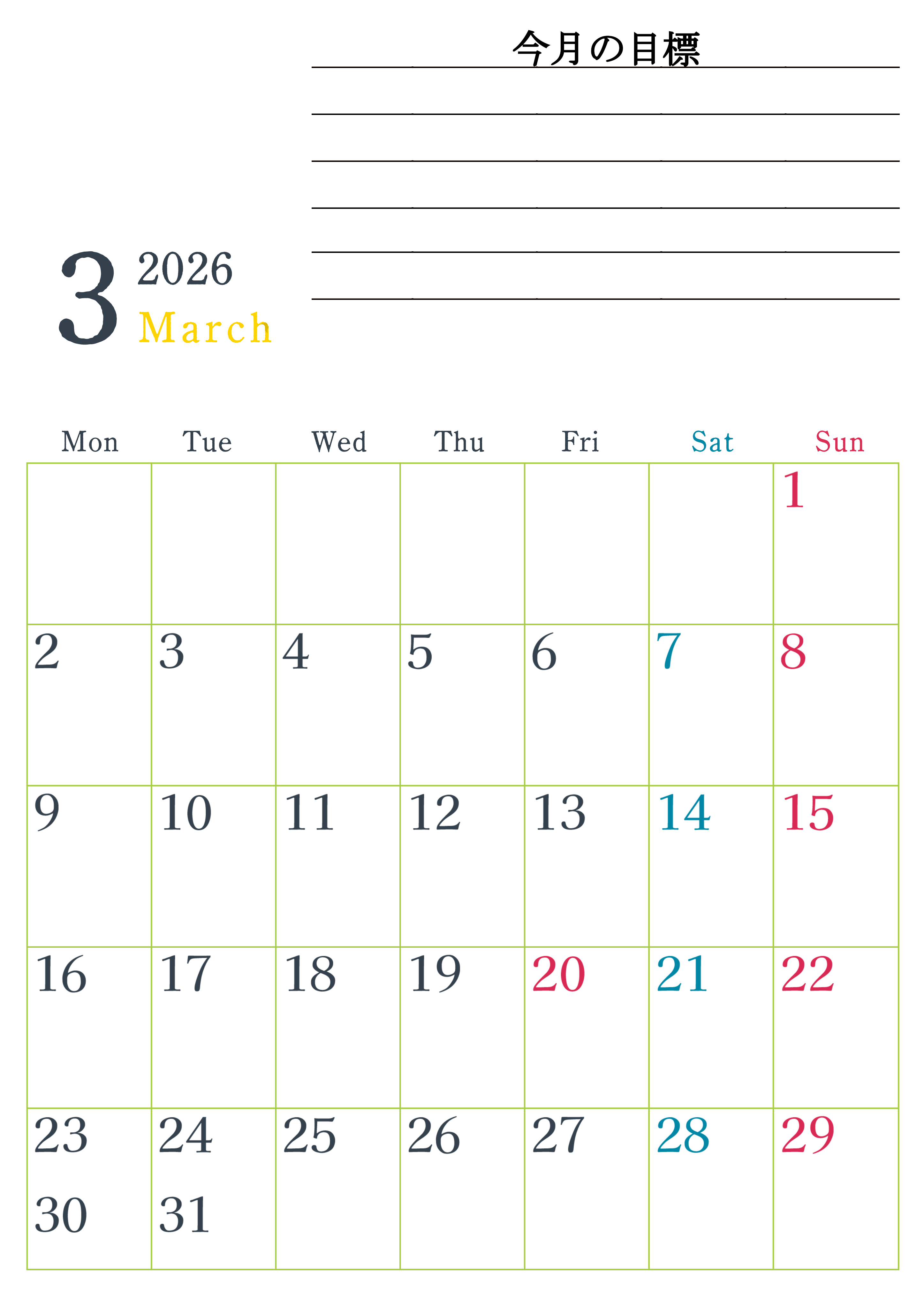2026年・無料のカレンダーテンプレート 2026年3月カレンダーは縦型月曜始まりで目標設定欄あり♪習慣の継続につながる無料素材(A4)(2026-01560311) 素材状デザイン王 2025年4月13日 2026年3月カレンダーは縦型月曜始まりで目標設定欄があります。習慣の継続につながる無料の素材なのでダウンロードを気軽に行えます。A4用紙に印刷をして計画を書き込みましょう。(2026-01560311) 3月 縦型のカレンダー 月曜始まり 目標 カレンダーデザイン-0156