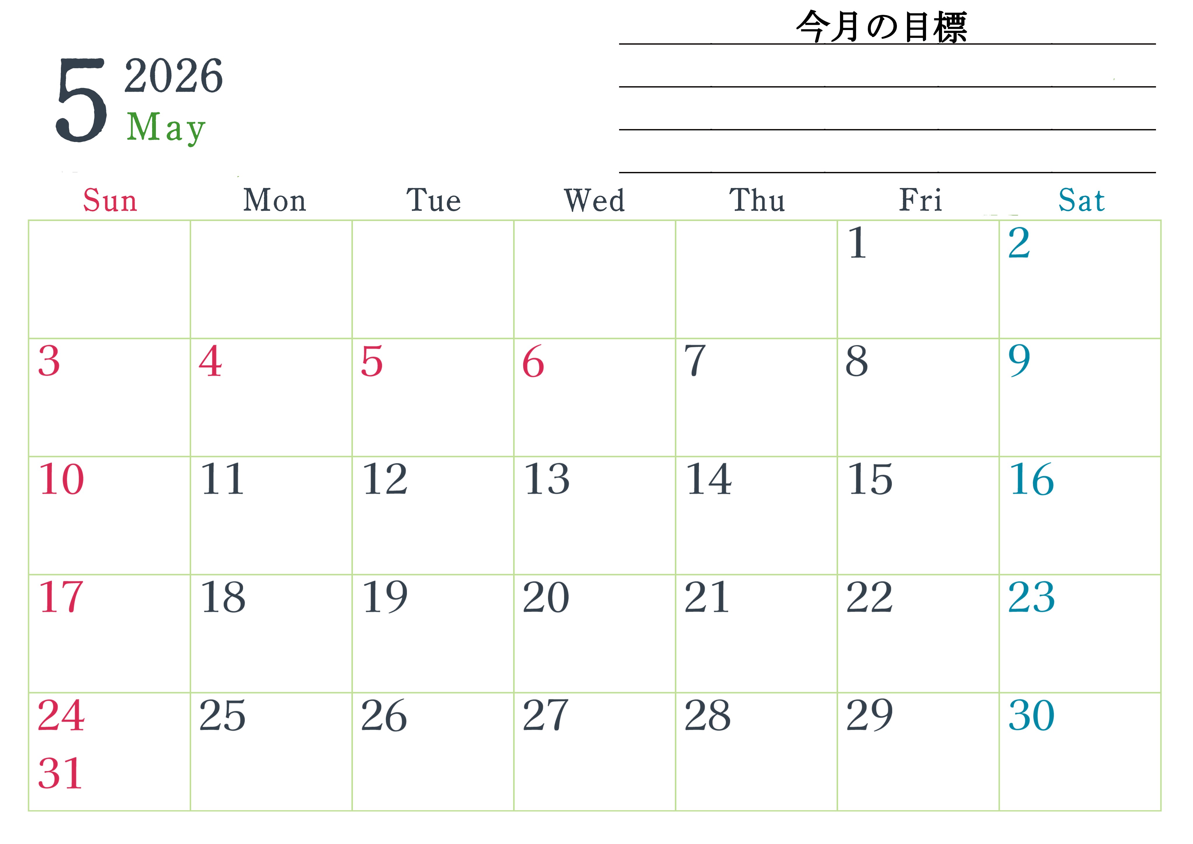 2026年・無料のカレンダーテンプレート 2026年5月カレンダーは横型日曜始まりで目標設定欄あり♪習慣の継続につながる無料素材(A4)(2026-01560500) 素材状デザイン王 2025年4月13日 2026年5月カレンダーは横型日曜始まりで目標設定欄があります。習慣の継続につながる無料の素材なのでダウンロードを気軽に行えます。A4用紙に印刷をして計画を書き込みましょう。(2026-01560500) 5月 横型のカレンダー 日曜始まり 目標 カレンダーデザイン-0156