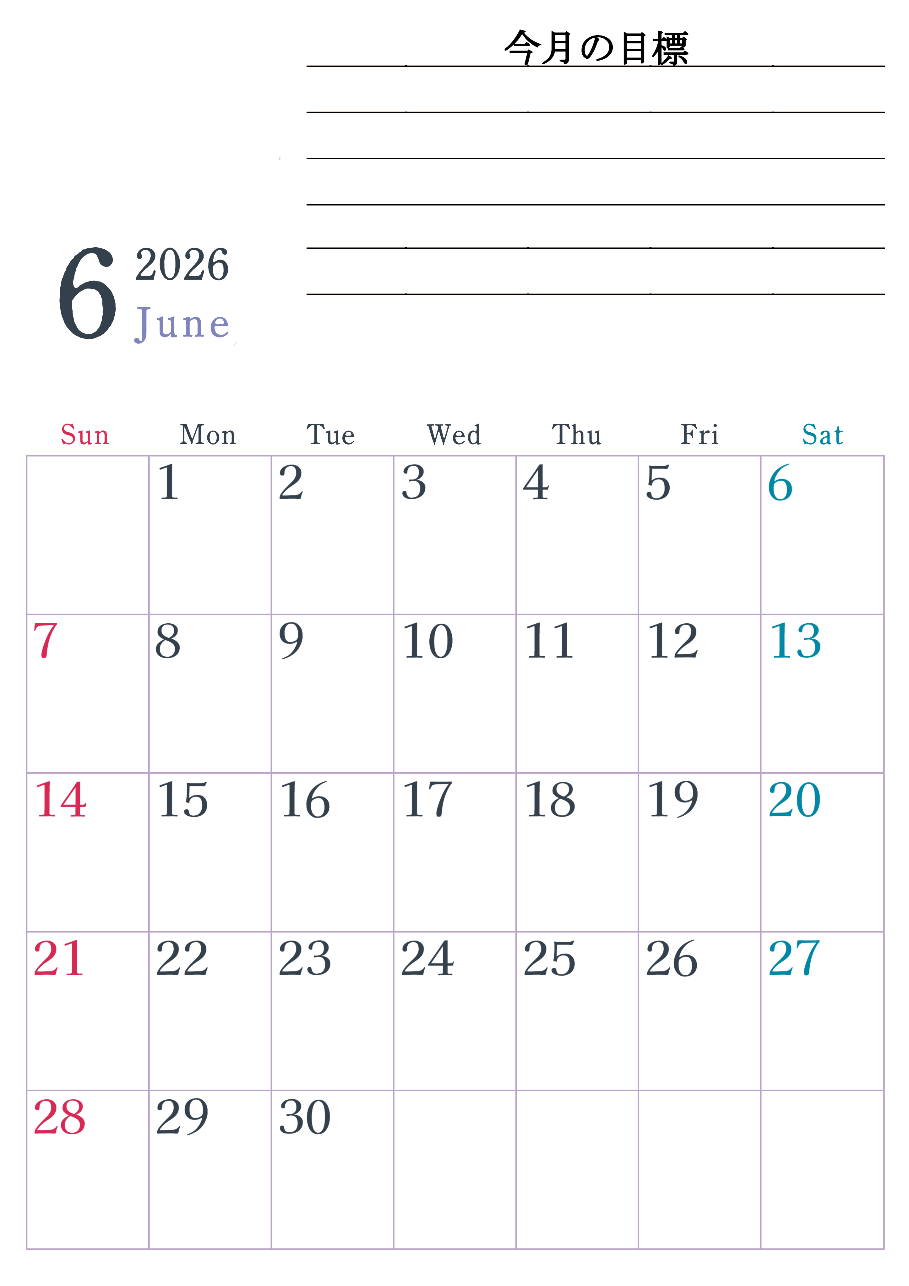 2026年・無料のカレンダーテンプレート 2026年6月カレンダーは縦型日曜始まりで目標設定欄あり♪習慣の継続につながる無料素材(A4)(2026-01560610) 素材状デザイン王 2025年4月13日 2026年6月カレンダーは縦型日曜始まりで目標設定欄があります。習慣の継続につながる無料の素材なのでダウンロードを気軽に行えます。A4用紙に印刷をして計画を書き込みましょう。(2026-01560610) 6月 縦型のカレンダー 日曜始まり 目標 カレンダーデザイン-0156