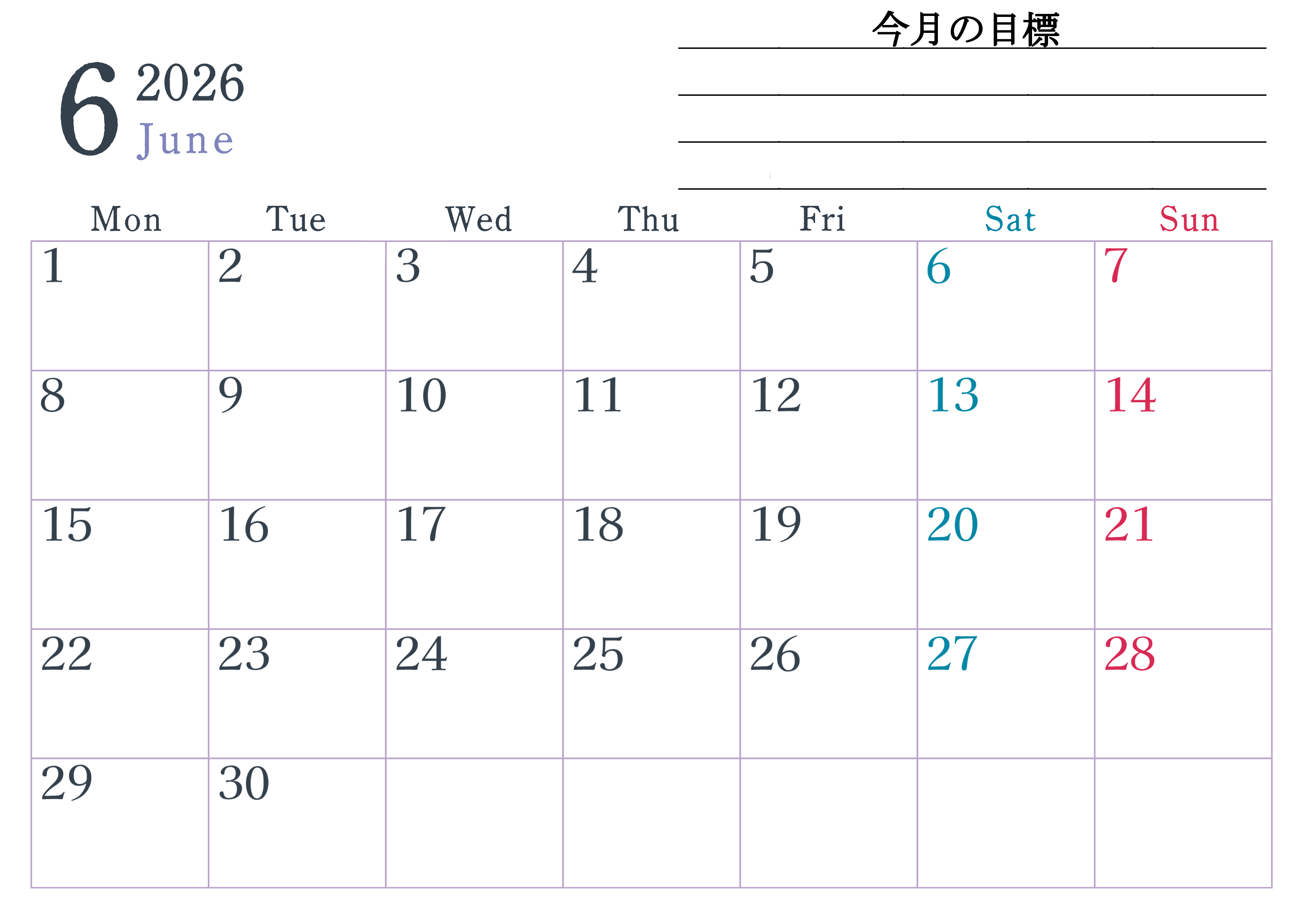 2026年6月カレンダーは横型月曜始まりで目標設定欄があります。習慣の継続につながる無料の素材なのでダウンロードを気軽に行えます。A4用紙に印刷をして計画を書き込みましょう。(2026-01560601)