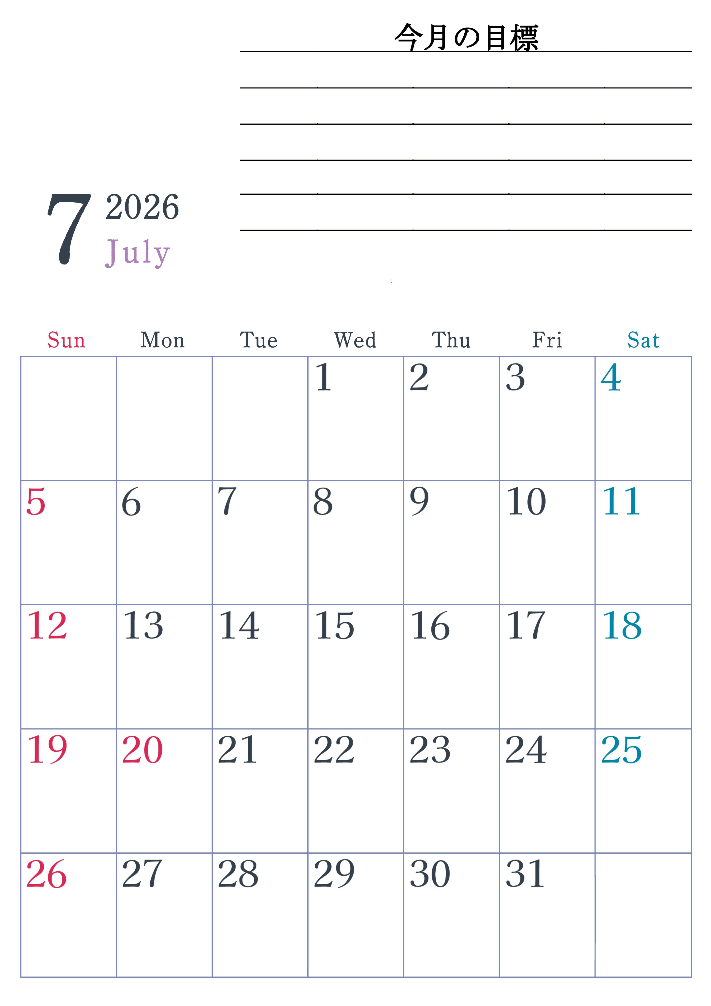 2026年・無料のカレンダーテンプレート 2026年7月カレンダーは縦型日曜始まり でベージュの花がおしゃれ:無料(2026-01560710) 素材状デザイン王 2025年4月13日 2026年7月カレンダーは縦型日曜始まりで目標設定欄があります。習慣の継続につながる無料の素材なのでダウンロードを気軽に行えます。A4用紙に印刷をして計画を書き込みましょう。(2026-01560710) 7月 縦型のカレンダー 日曜始まり 目標 カレンダーデザイン-0156