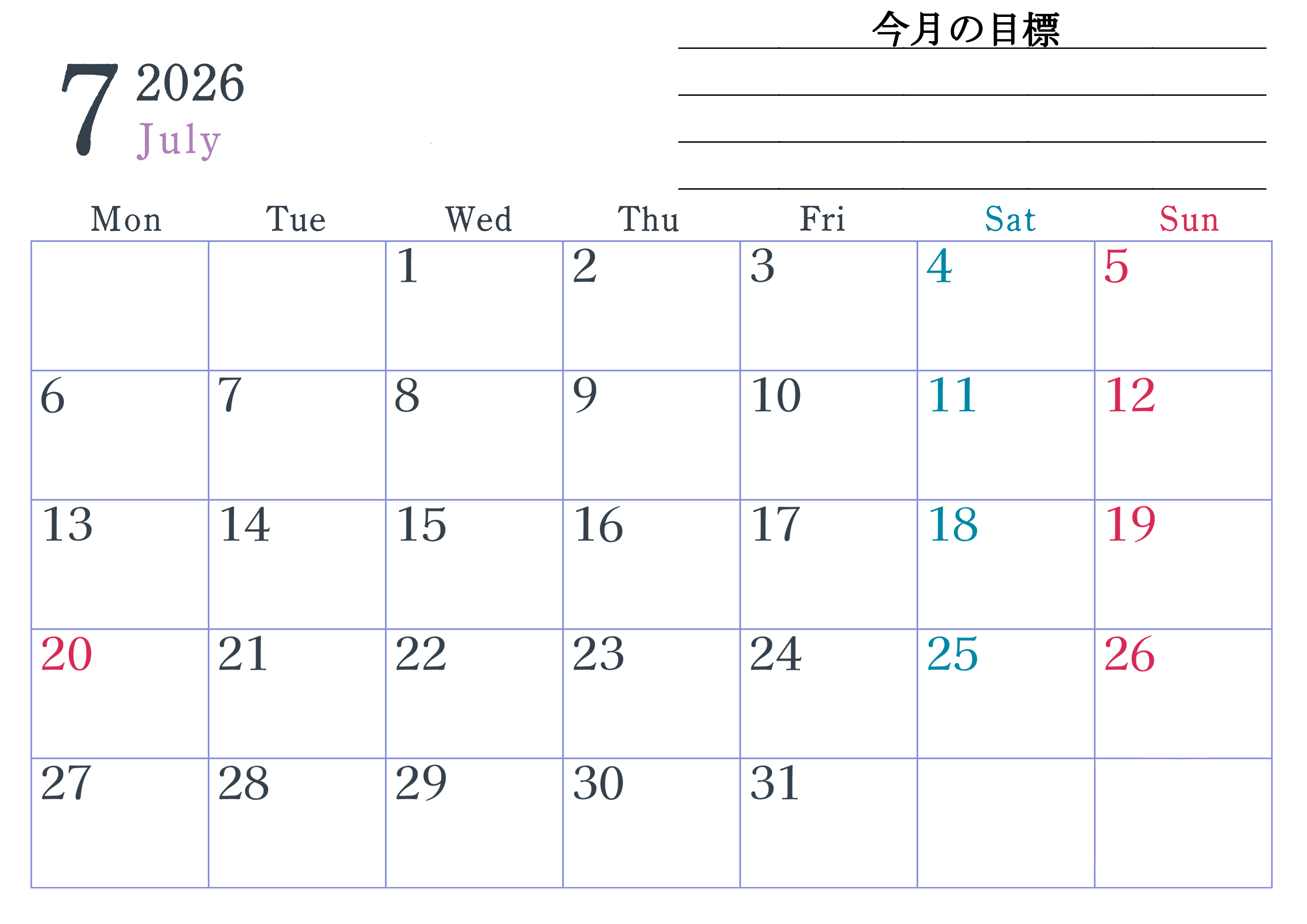 2026年・無料のカレンダーテンプレート 2026年7月カレンダーは横型月曜始まり でベージュの花がおしゃれ:無料(2026-01560701) 素材状デザイン王 2025年4月13日 2026年7月カレンダーは横型月曜始まりで目標設定欄があります。習慣の継続につながる無料の素材なのでダウンロードを気軽に行えます。A4用紙に印刷をして計画を書き込みましょう。(2026-01560701) 7月 横型のカレンダー 月曜始まり 目標 カレンダーデザイン-0156