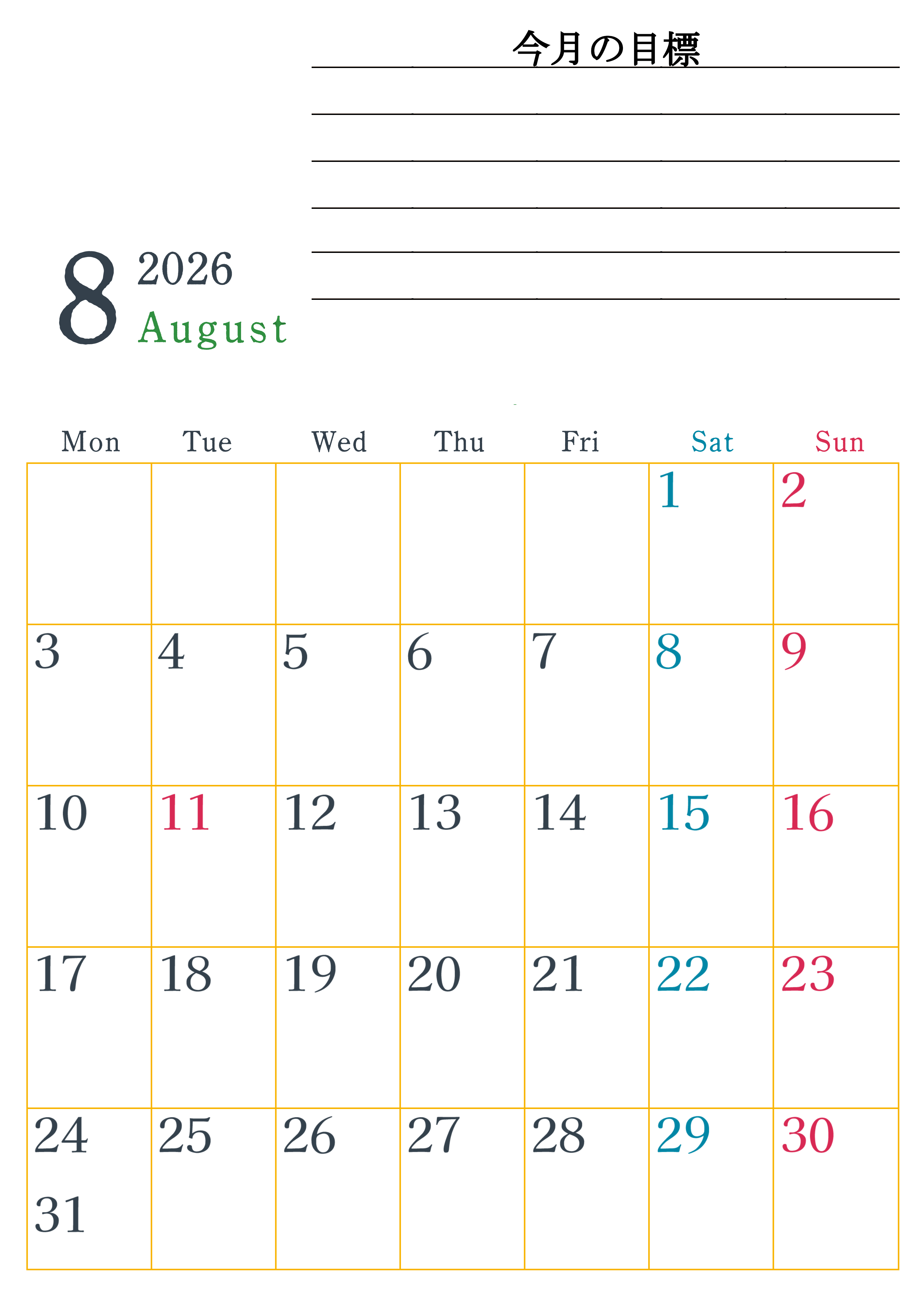 2026年・無料のカレンダーテンプレート 2026年8月カレンダーは縦型月曜始まりで目標設定欄あり♪習慣の継続につながる無料素材(A4)(2026-01560811) 素材状デザイン王 2025年4月13日 2026年8月カレンダーは縦型月曜始まりで目標設定欄があります。習慣の継続につながる無料の素材なのでダウンロードを気軽に行えます。A4用紙に印刷をして計画を書き込みましょう。(2026-01560811) 8月 縦型のカレンダー 月曜始まり 目標 カレンダーデザイン-0156