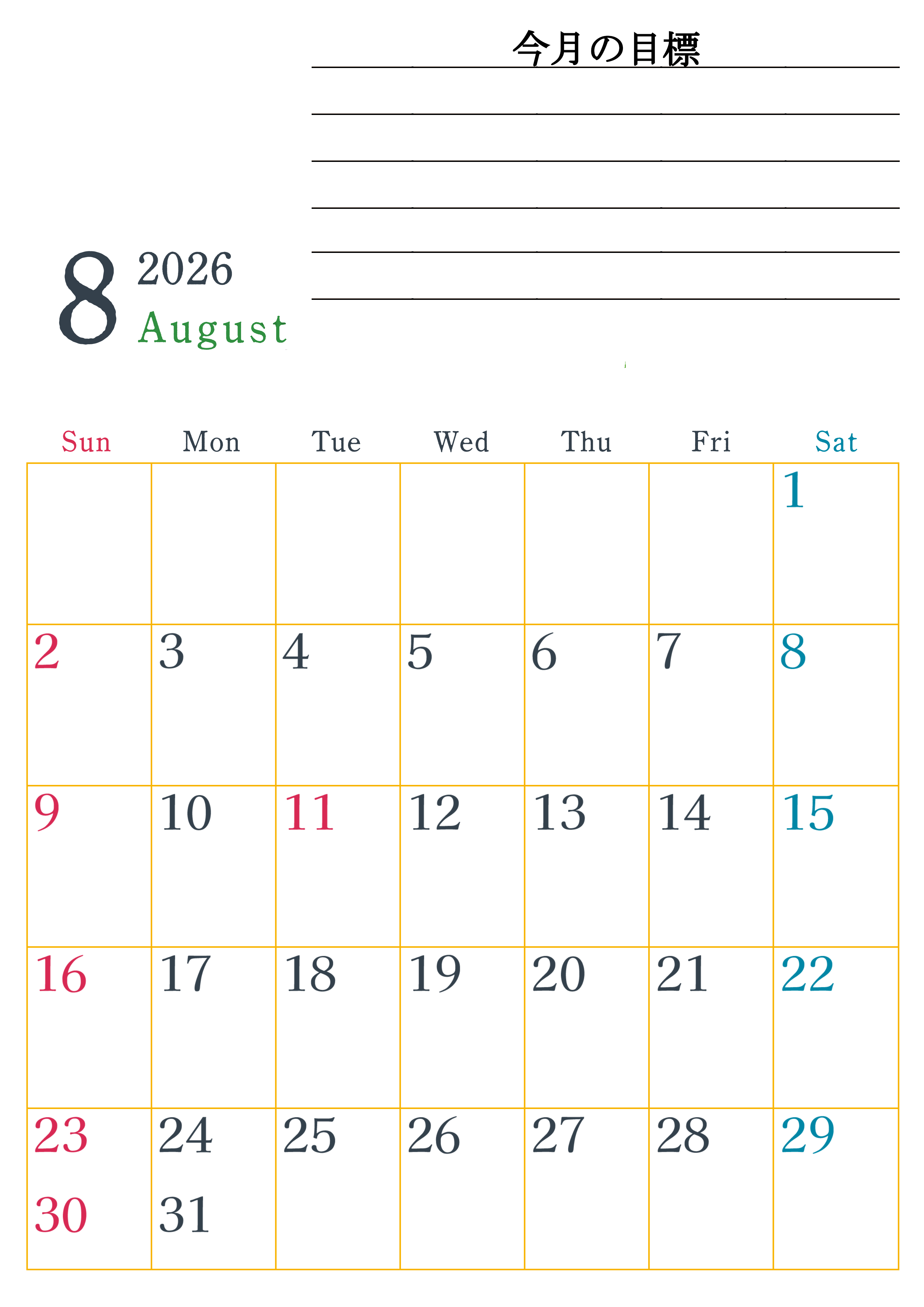 2026年・無料のカレンダーテンプレート 2026年8月カレンダーは縦型日曜始まりで目標設定欄あり♪習慣の継続につながる無料素材(A4)(2026-01560810) 素材状デザイン王 2025年4月13日 2026年8月カレンダーは縦型日曜始まりで目標設定欄があります。習慣の継続につながる無料の素材なのでダウンロードを気軽に行えます。A4用紙に印刷をして計画を書き込みましょう。(2026-01560810) 8月 縦型のカレンダー 日曜始まり 目標 カレンダーデザイン-0156