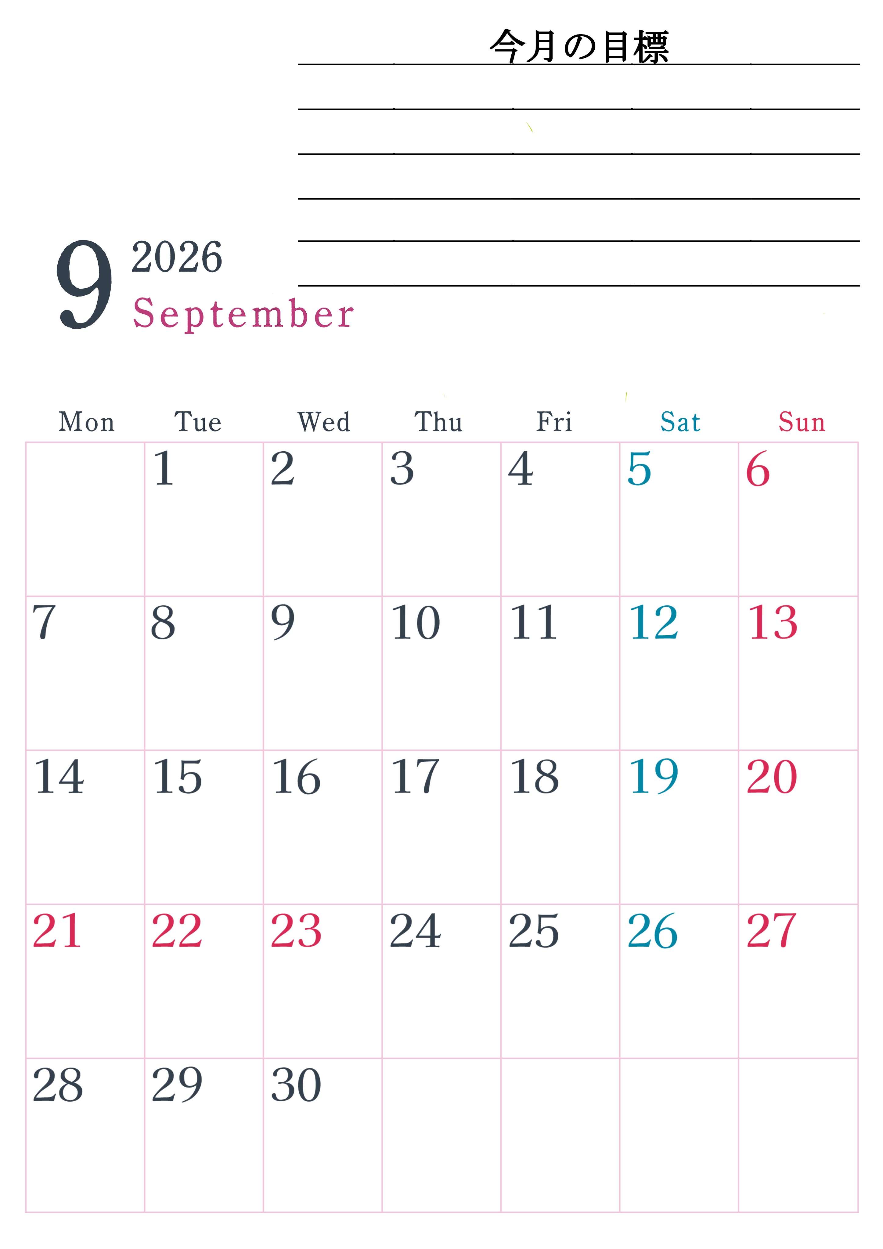 2026年・無料のカレンダーテンプレート 2026年9月カレンダーは縦型月曜始まりで目標設定欄あり♪習慣の継続につながる無料素材(A4)(2026-01560911) 素材状デザイン王 2025年4月13日 2026年9月カレンダーは縦型月曜始まりで目標設定欄があります。習慣の継続につながる無料の素材なのでダウンロードを気軽に行えます。A4用紙に印刷をして計画を書き込みましょう。(2026-01560911) 9月 縦型のカレンダー 月曜始まり 目標 カレンダーデザイン-0156
